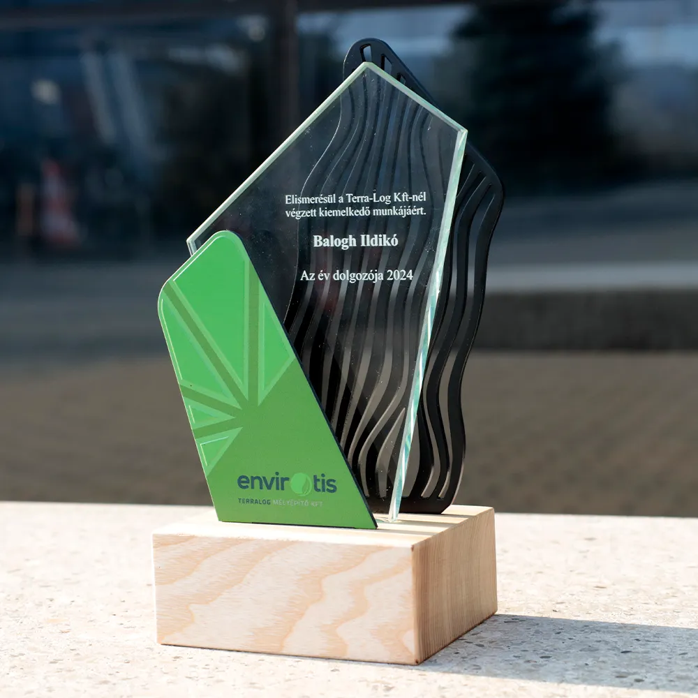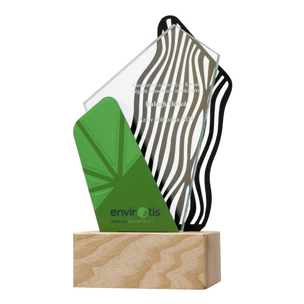 Trofeo empresarial diseñado como reconocimiento a logros sobresalientes en protección ambiental y desarrollo sostenible, otorgado por Envirotis. El trofeo está hecho de tres materiales principales: madera maciza, metal y vidrio. El grabado láser en la sección de vidrio enfatiza el prestigio del premio, mientras que los acentos metálicos añaden modernidad y durabilidad.