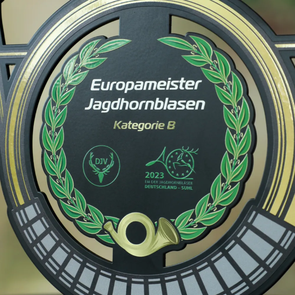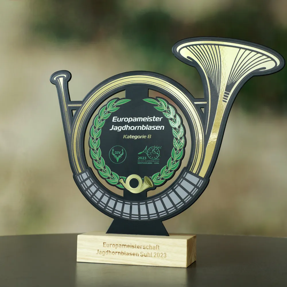 Trofeo personalizado para Europameister Jagdhornblasen Suhl 2023. El premio tiene forma de cuerno de caza con un centro circular que lleva inscripciones, combinando acero y una base de madera clara.