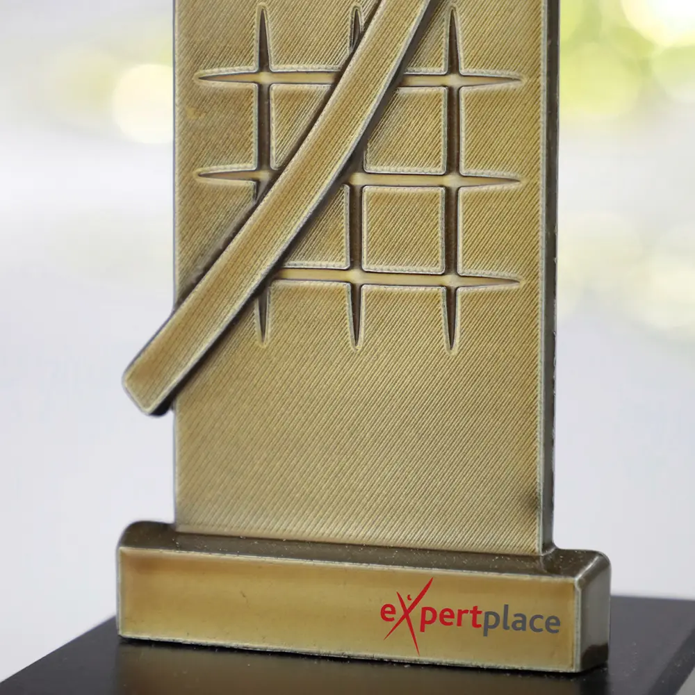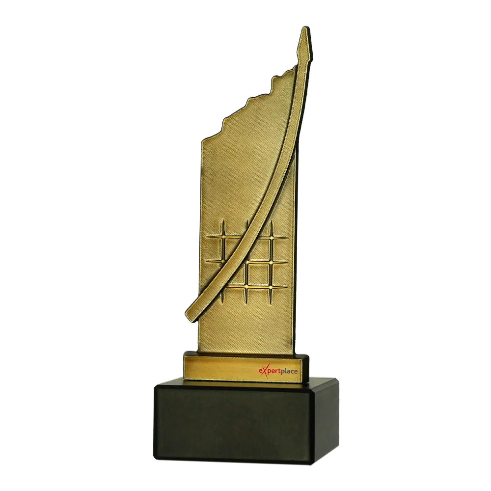 Trofeo empresarial diseñado para el Expert Place Trophy. El trofeo tiene una forma geométrica con elementos de líneas y cuadrícula, dándole un aspecto moderno. La forma fue creada mediante fundición precisa. La base está hecha de mármol.