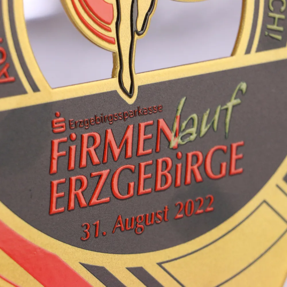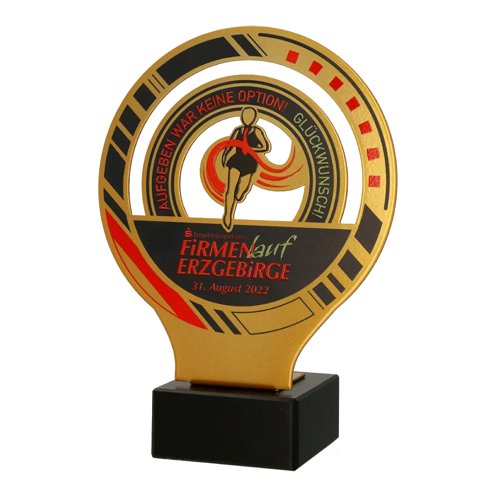 El trofeo personalizado fue diseñado especialmente para el evento Firmenlauf Erzgebirge. Los colores dorado y negro, combinados con gráficos dinámicos de corredores, le dan al premio una apariencia moderna.