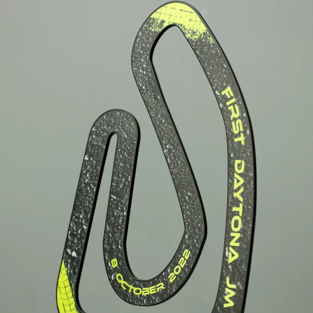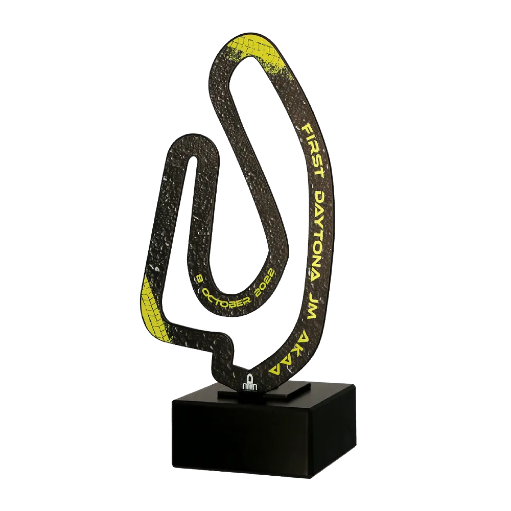 Las carreras generan una adrenalina extraordinaria en las personas. La sienten tanto los participantes como los aficionados que animan al ganador. Sin embargo, además de la admiración del público, el ganador suele recibir premios conmemorativos que simbolizan su éxito. Uno de estos premios es el trofeo que preparamos para el First Daytona JM Akaa. Este trofeo moderno de automovilismo fue fabricado mediante corte láser. Su precisión nos permitió reproducir perfectamente la forma del circuito donde se celebró la competición. Gracias a esto, el ganador recordará por más tiempo el hecho de haber ganado el premio. Sin embargo, el trofeo destaca no solo por su forma original. Su singularidad también queda evidenciada por una impresión colorida y una base masiva de mármol, que hace que todo sea extremadamente estable.