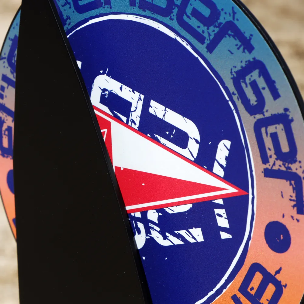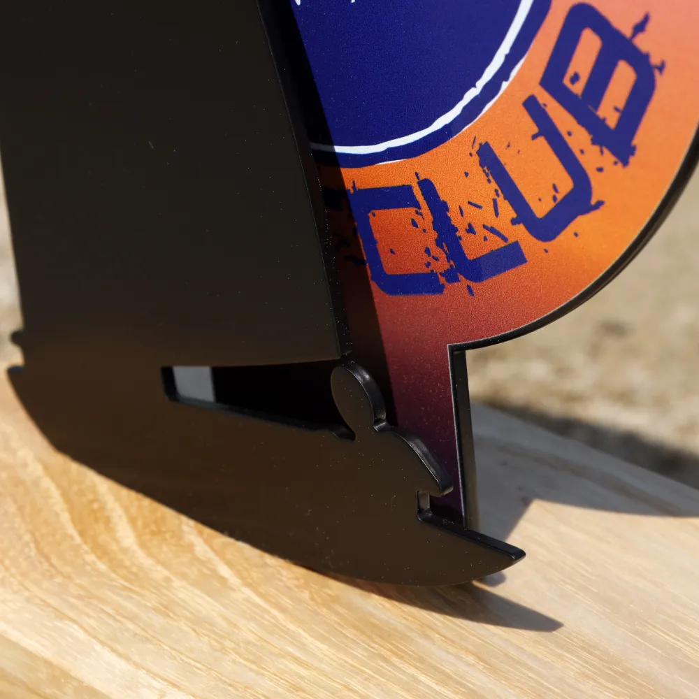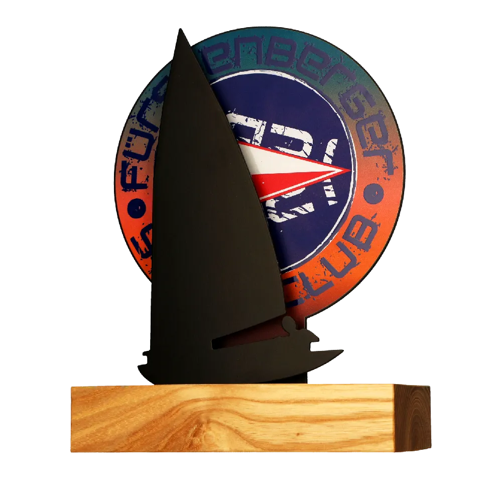 Trofeo personalizado diseñado para un evento de vela. Presenta una forma de vela negra frente a un fondo circular colorido con el logo del club. El premio descansa sobre una base de madera natural.