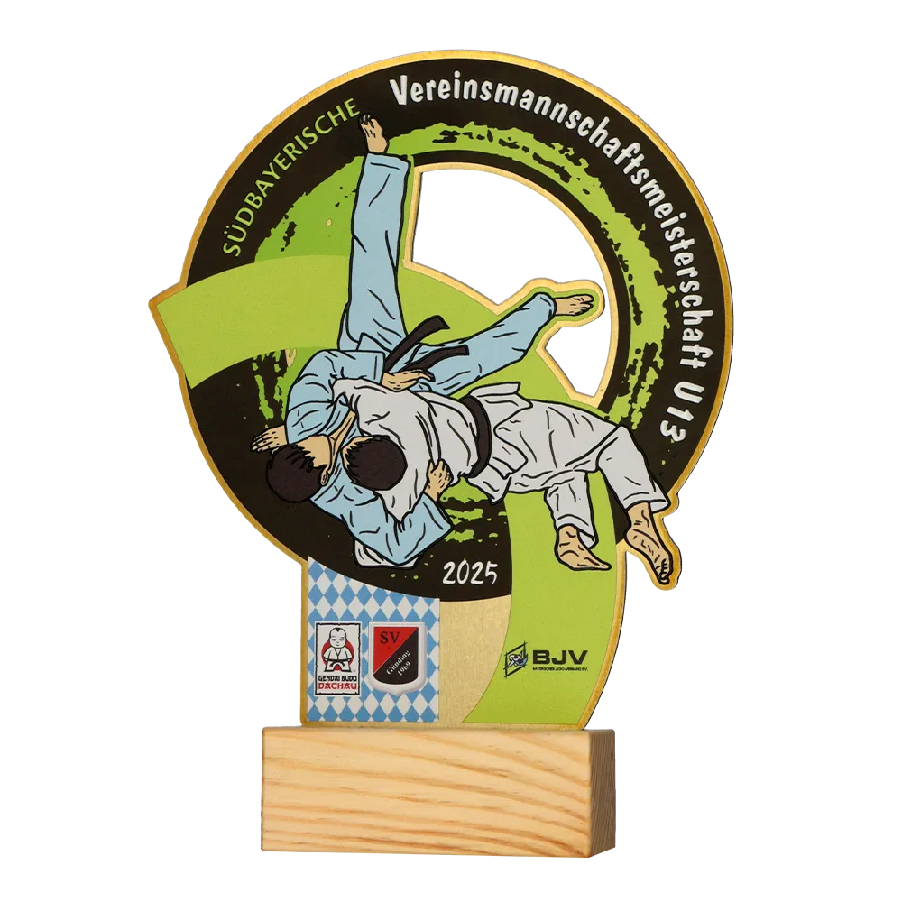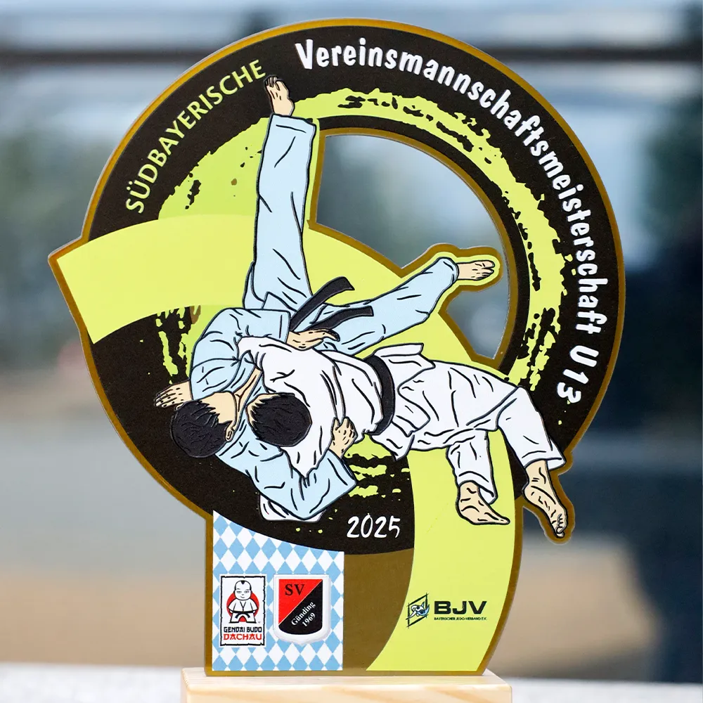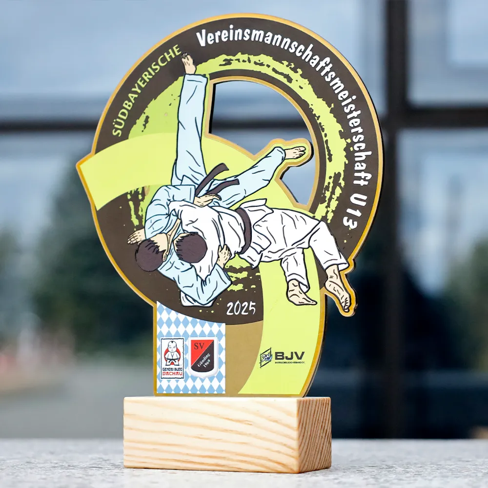 Trofeo deportivo de metal colocado sobre una base de madera. La forma fue recortada con láser y los adornos a color se realizaron con impresión UV. El motivo dinámico muestra a judocas en acción, resaltando el carácter deportivo del premio. Este trofeo deportivo fue preparado para una competición de judo.