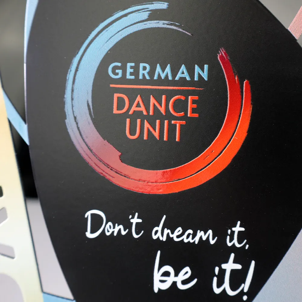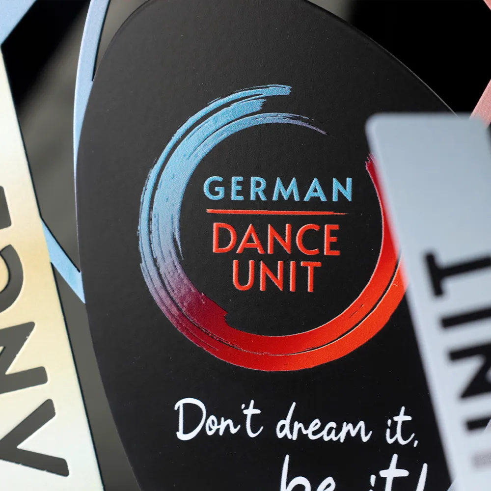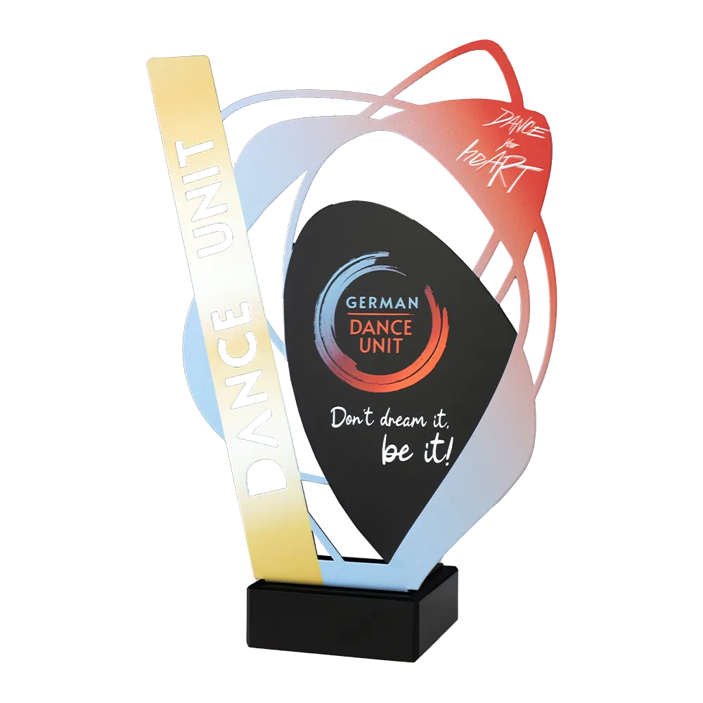 Este trofeo de metal está hecho de metal y su forma fue cortada con láser con precisión. Las decoraciones coloridas son una impresión UV duradera que garantiza colores vivos. La base está hecha de mármol, lo que añade estabilidad al trofeo. Es un trofeo especialmente preparado para competiciones de baile, como se puede ver en la temática y las inscripciones en él.