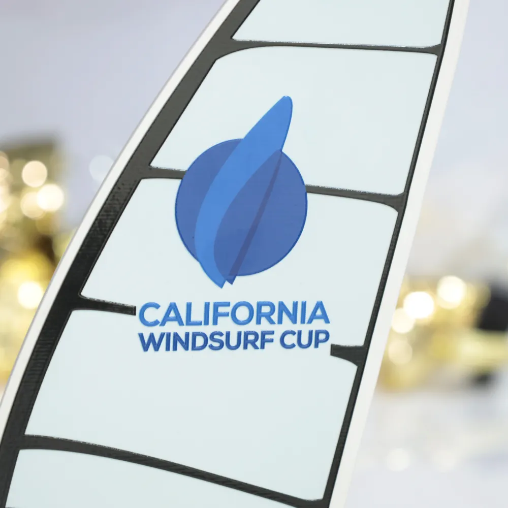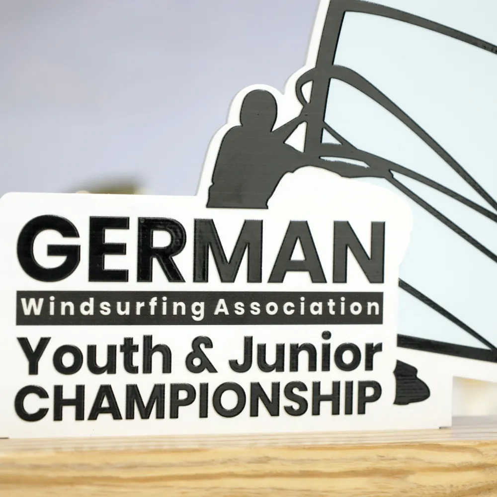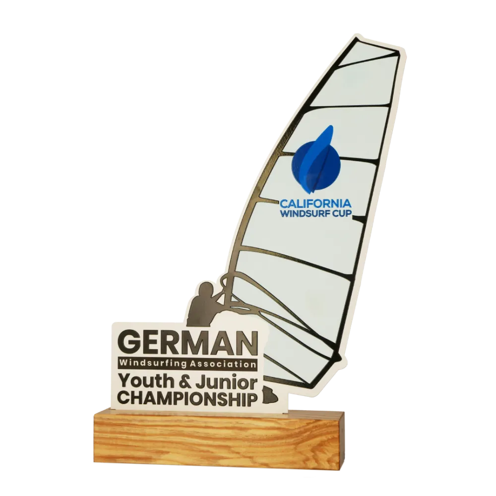 Trofeo personalizado creado para la Asociación Alemana de Windsurf es un reconocimiento único, cortado con láser en forma de vela, reflejando el deporte del windsurf. El trofeo incluye un velero y logos relacionados con el evento, destacando su carácter deportivo. Los detalles y decoraciones fueron realizados mediante tecnología de impresión UV. Toda la pieza está colocada sobre una base de madera resistente.