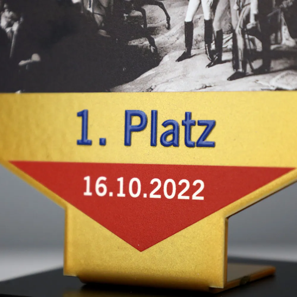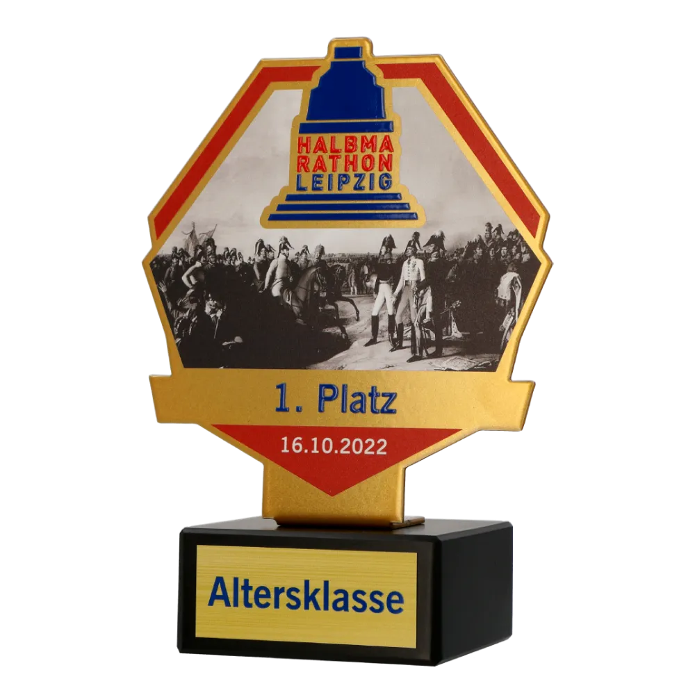 El trofeo personalizado que creamos para el ganador del Medio Maratón de Leipzig es una pieza metálica dorada montada sobre una base de mármol negro. El trofeo incluye una foto histórica, el logotipo de la carrera y la fecha.