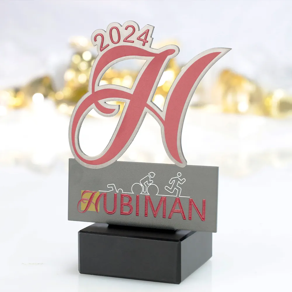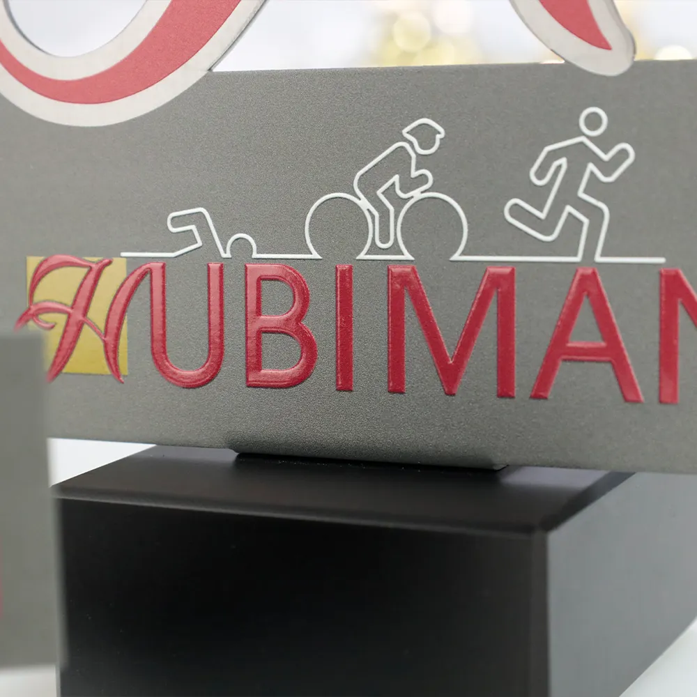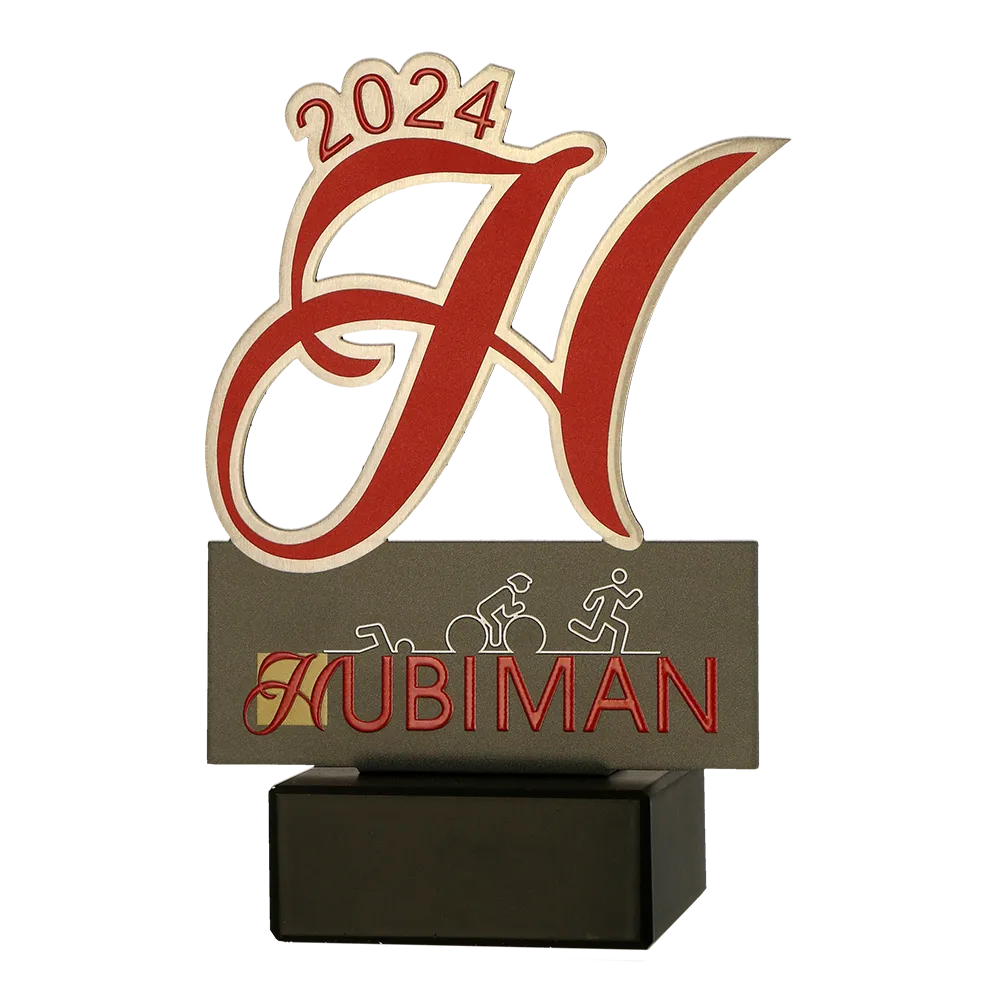 El trofeo personalizado diseñado para Hubiman 2024 es un trofeo único que combina estilo clásico con diseño moderno. Hecho de metal, el premio tiene la forma de una gran letra "H" estilizada, simbolizando el nombre del evento. Los acentos y detalles en rojo han sido impresos con precisión mediante tecnología UV, añadiendo viveza al trofeo. En la parte inferior, sobre la superficie metálica, se representan imágenes de las tres disciplinas del triatlón, destacando perfectamente la naturaleza deportiva del evento.