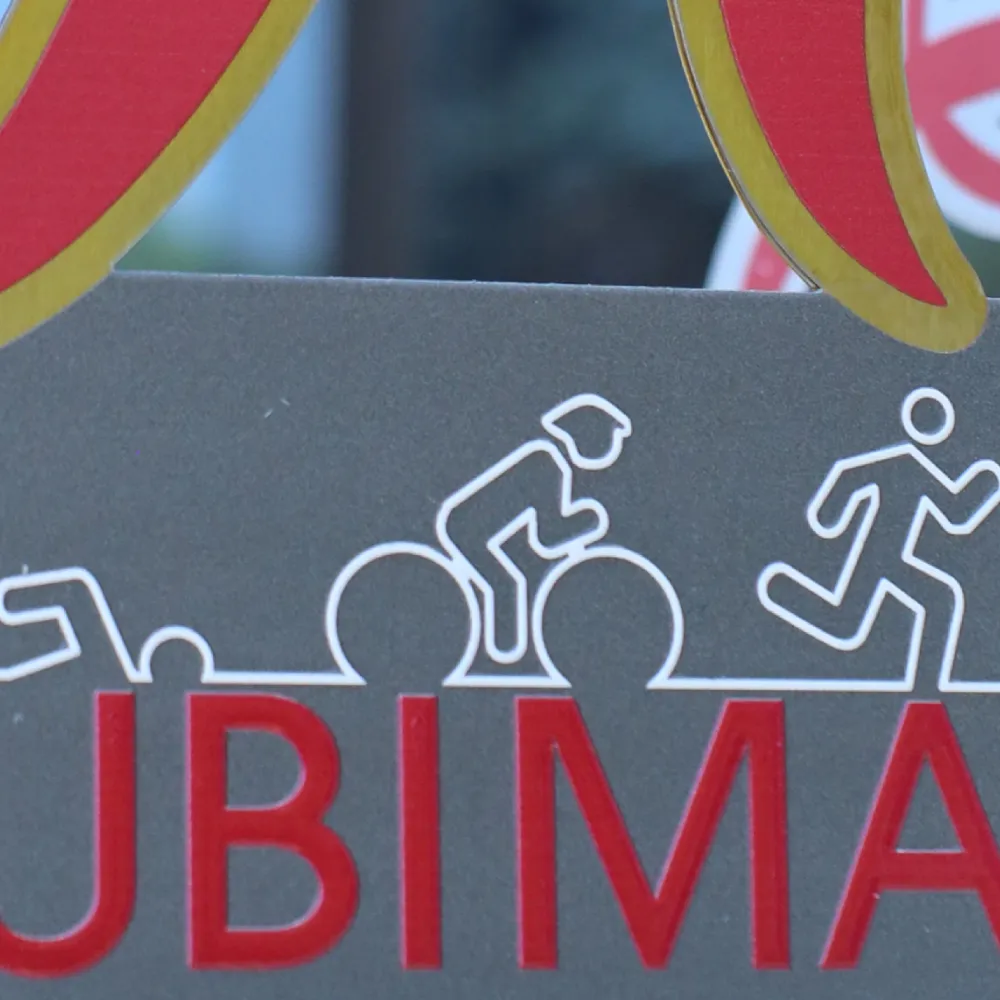 Trofeo de metal sobre base negra estable, preparado para el evento HUBIMAN. En el frente se han colocado pictogramas de tres disciplinas y el logotipo rojo, y en la parte superior la letra "H" estilizada con el año. El corte láser de precisión y la impresión UV a color garantizan detalles nítidos y durabilidad del acabado. Este trofeo de triatlón está creado pensando en los ganadores.