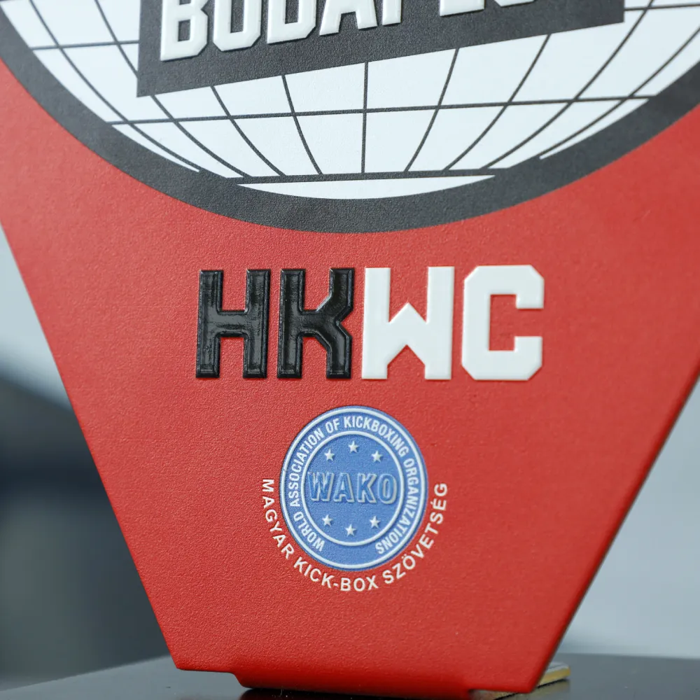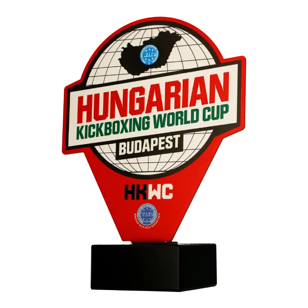 Trofeo personalizado diseñado para la Hungarian Kickboxing World Cup Budapest. El premio presenta un diseño circular audaz con el nombre del evento destacado sobre un fondo de globo terráqueo. Fabricado en acero, está montado sobre una base rectangular negra.