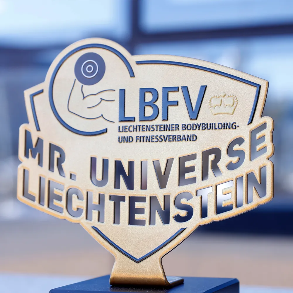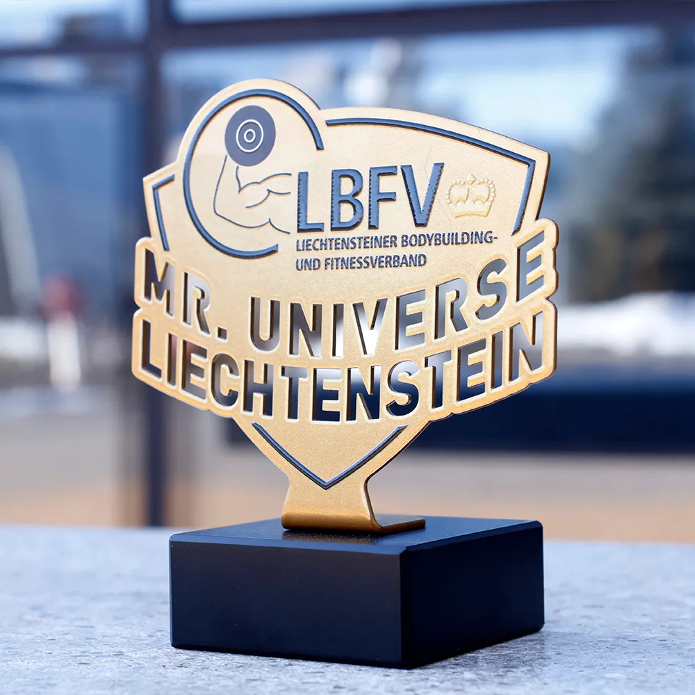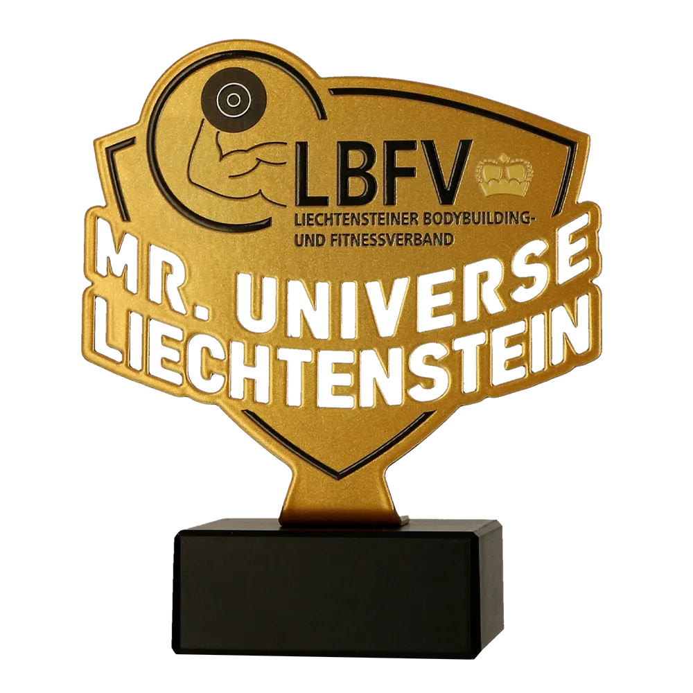 Trofeo de culturismo hecho de metal sobre una base de mármol. Creado para la competición Mr. Universe Liechtenstein, organizada por la Liechtensteiner Bodybuilding und Fitnessverband (LBFV). Presenta un color dorado con detalles en negro y un gráfico en relieve que muestra una barra con pesas y el logo de la organización.