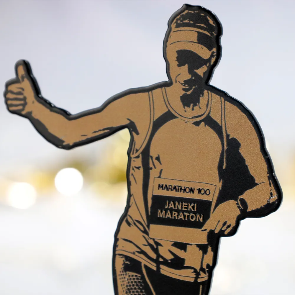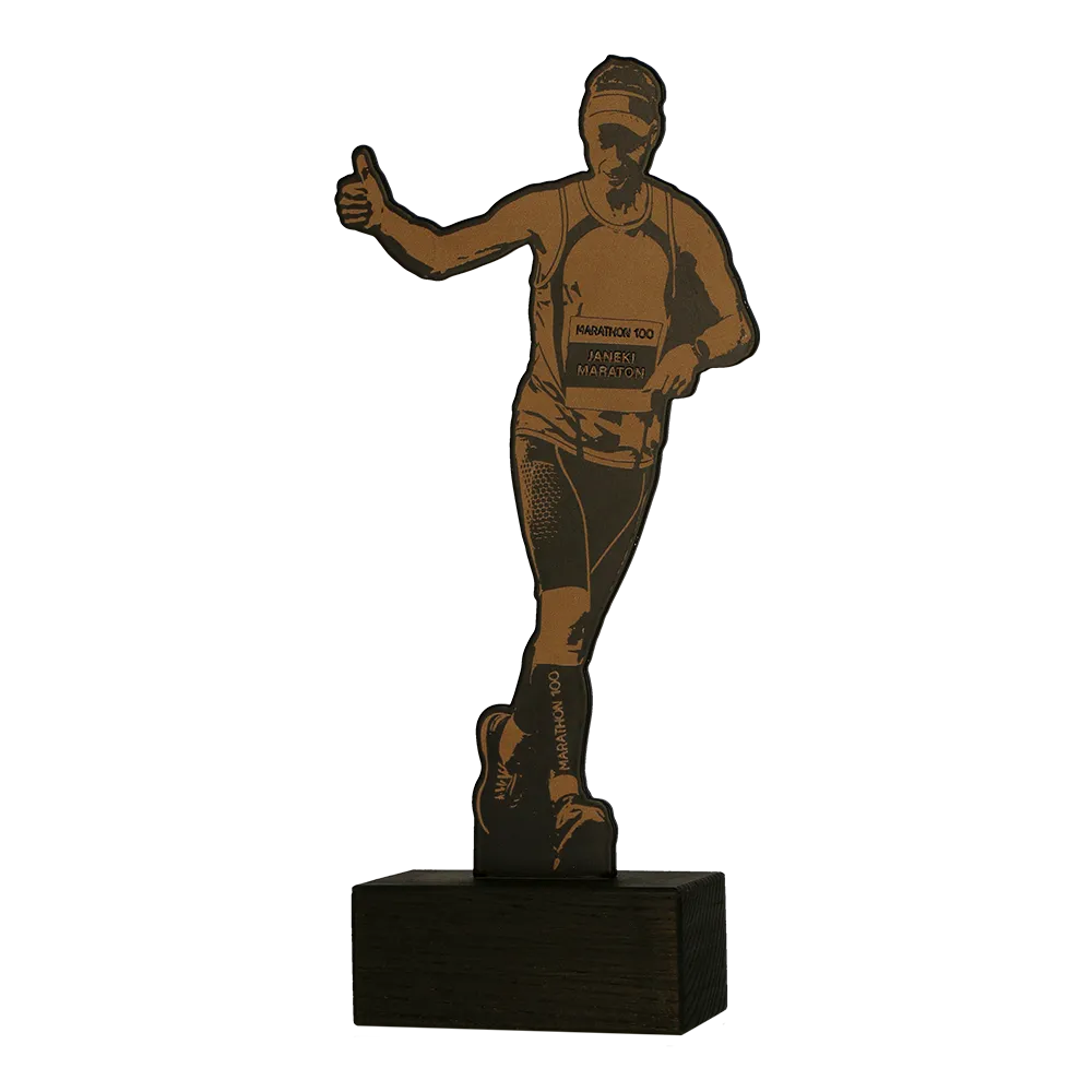 Trofeo para correr hecho para el Janeki Marathon 2024. El premio tiene forma de una persona corriendo con el pulgar levantado. El gráfico en la parte superior se creó mediante impresión UV. Cortamos la forma con láser para capturar la silueta del corredor. La parte superior es de metal y la base de mármol, asegurando estabilidad.