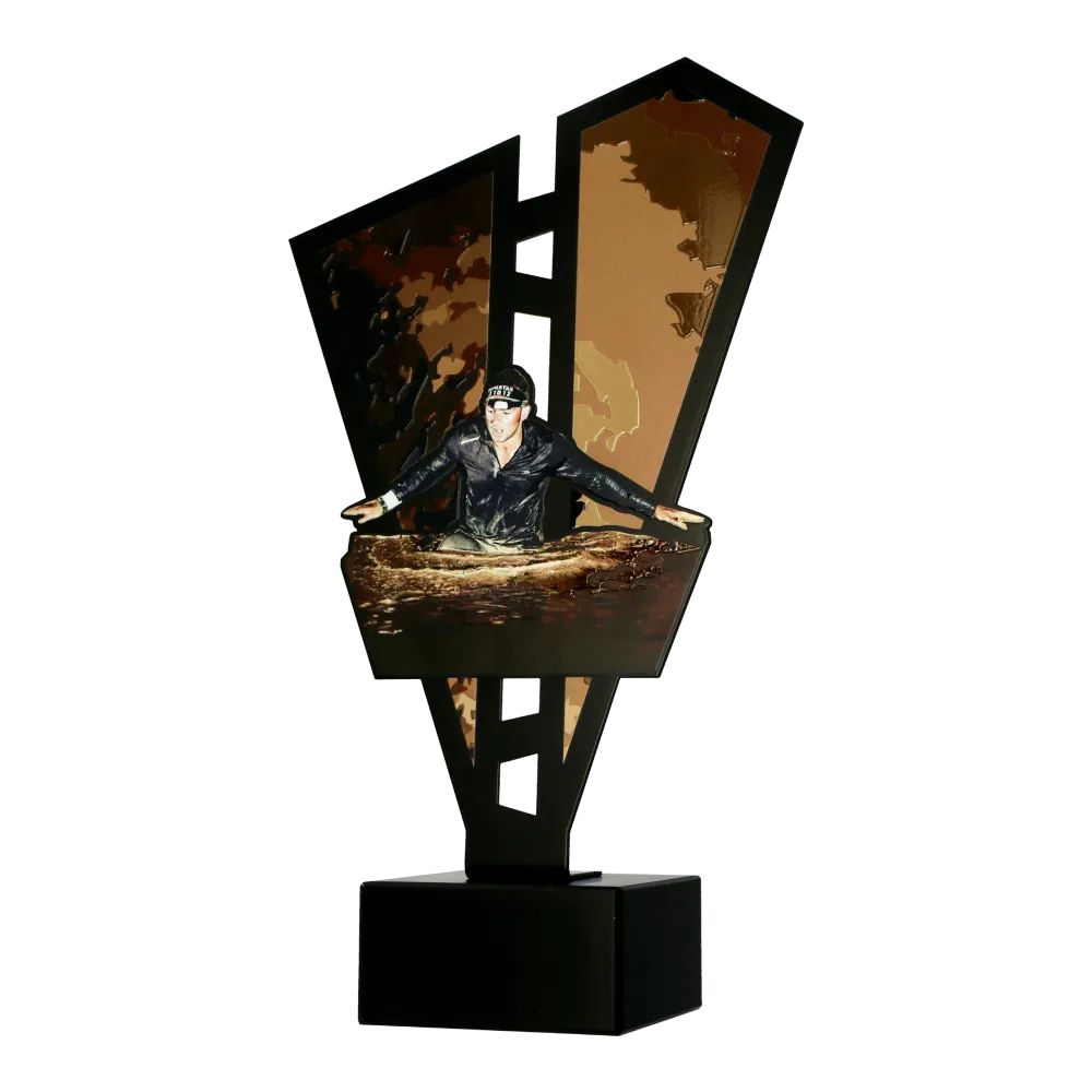 El trofeo está cortado en metal doblado en la base. En su superficie hay una impresión UV colorida cubierta con barniz que brilla a la luz.