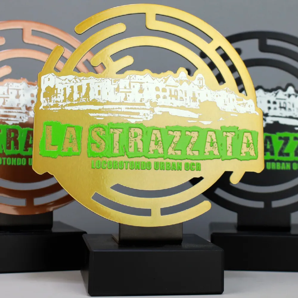 Trofeo de metal redondo con un elegante calado. El conjunto está disponible en tres colores cubiertos con una impresión con efecto 3D.