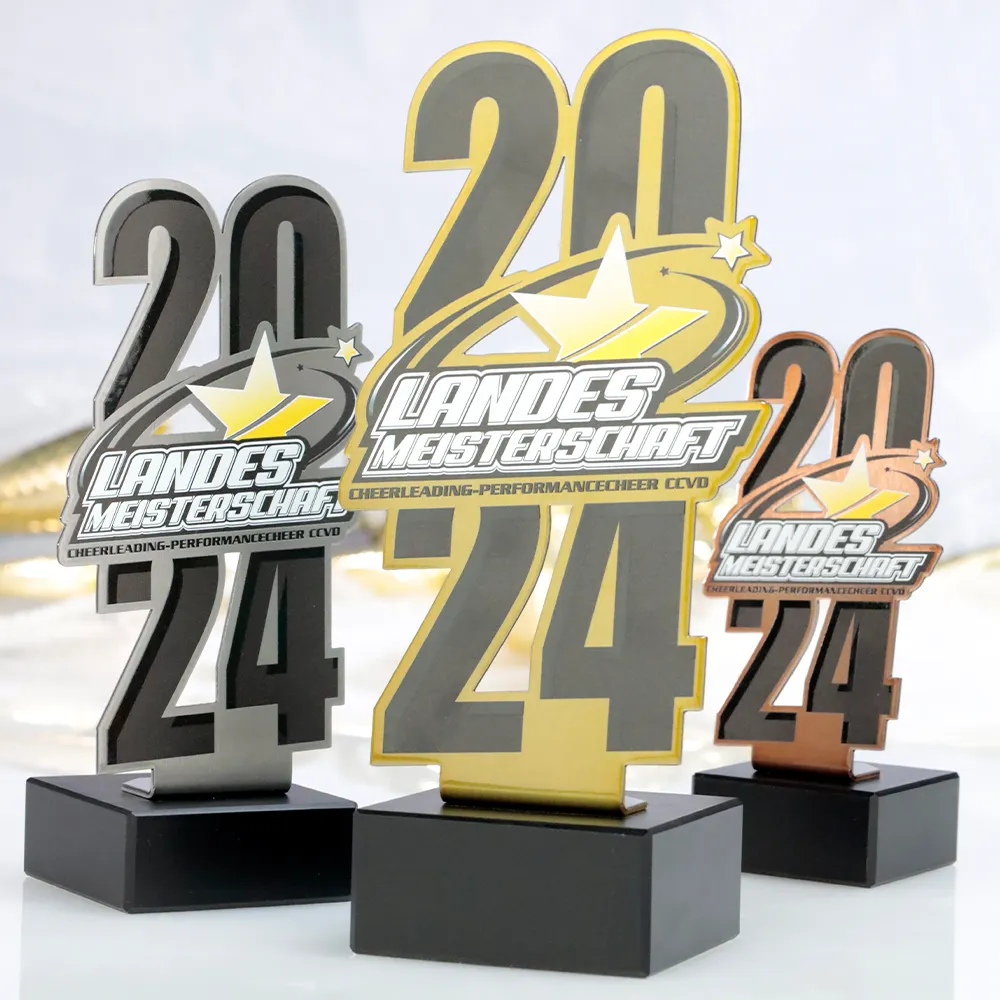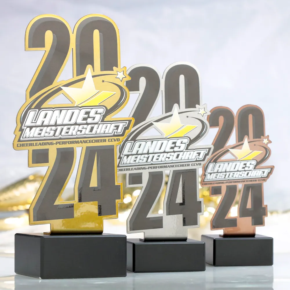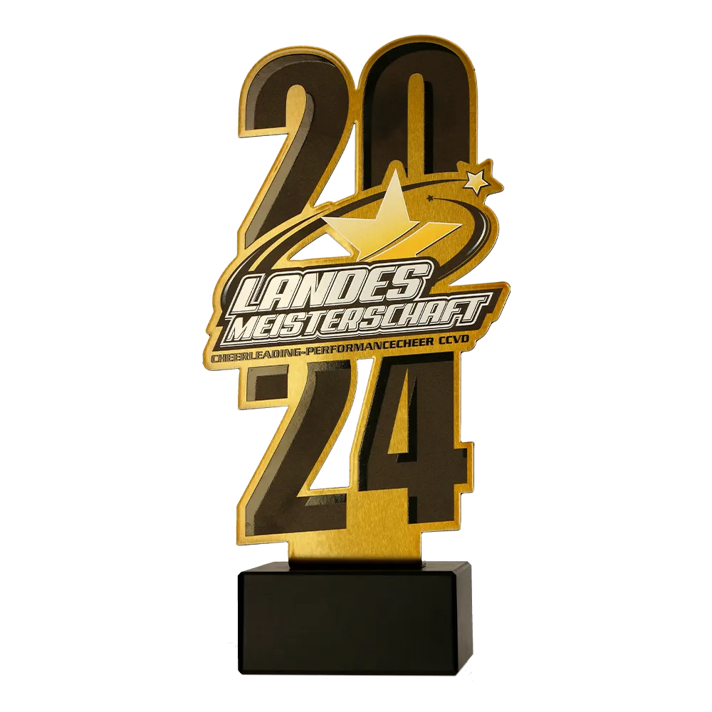 Trofeo personalizado creado para el campeonato regional de animadoras “Landesmeisterschaft Cheerleading 2024”. Hecho de metal con impresión UV, garantiza colores duraderos y detalles nítidos. La base sólida de mármol añade estabilidad y un carácter exclusivo al diseño.