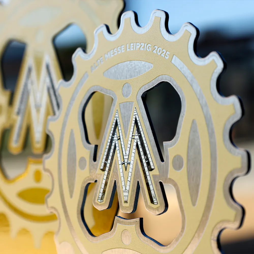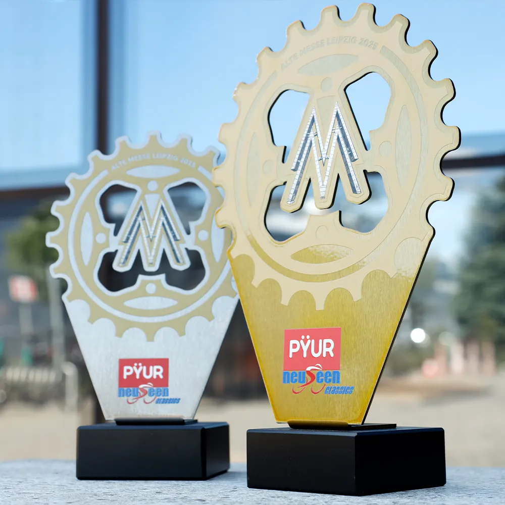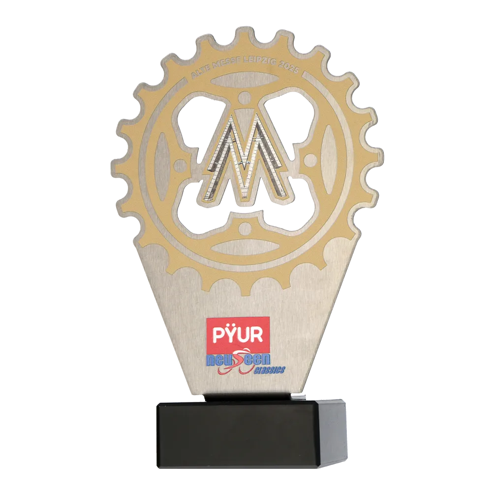 Trofeo de metal colocado sobre una base de mármol. La forma fue recortada con precisión con láser y los adornos y logotipos aplicados con impresión UV. El elemento distintivo del diseño es una rueda dentada que resalta la temática del evento. Este trofeo deportivo fue preparado para una competición de ciclismo.