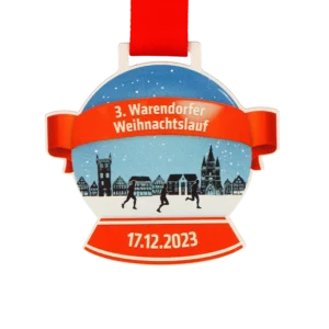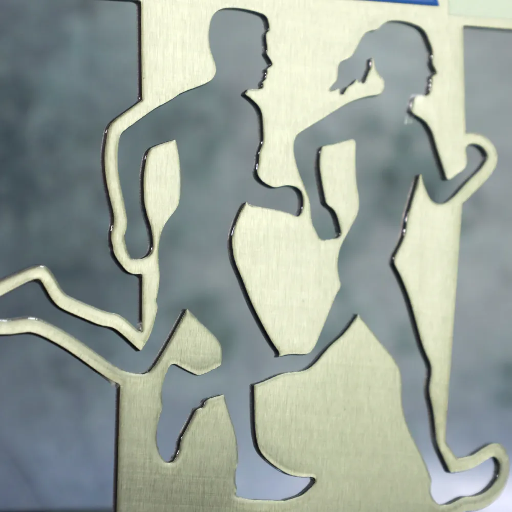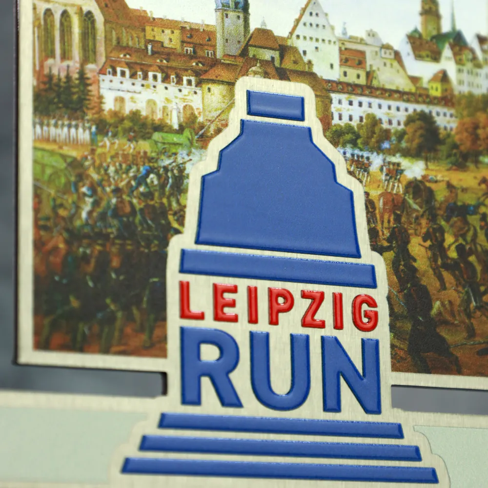 Trofeo para correr diseñado para Leipzig Run 2023. El premio, cortado con láser en metal, presenta figuras de corredores con un fondo colorido impreso en UV que representa Leipzig. Una base de mármol añade estabilidad.