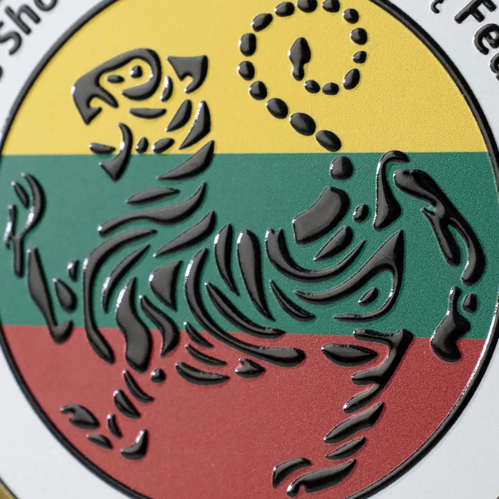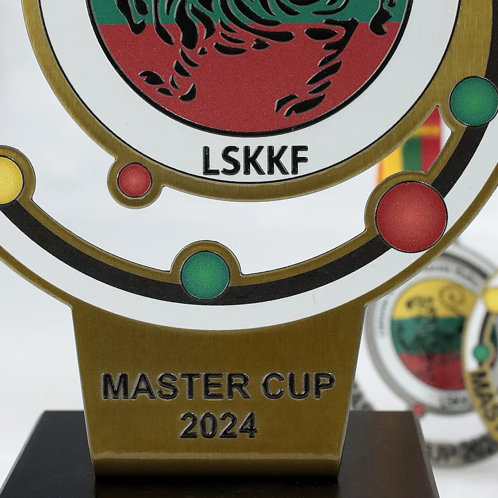 Premio personalizado diseñado específicamente para la competición de Lietuvos Shotokan Karatė Klubų Federacija. El trofeo tiene forma redonda, está hecho de metal sólido en color dorado, con detalles coloridos que representan el logo de la federación. El motivo central es un tigre sobre el fondo de la bandera de Lituania.