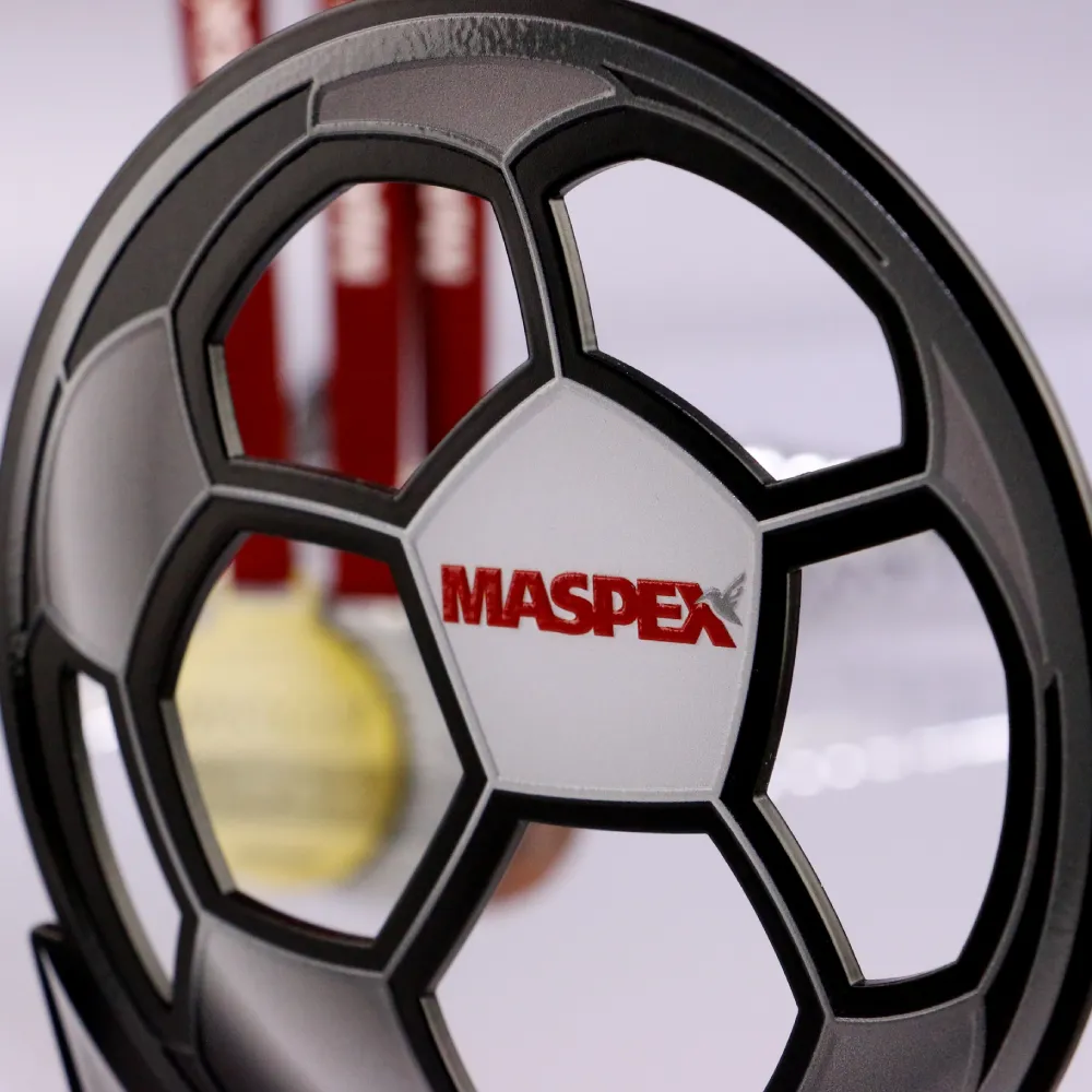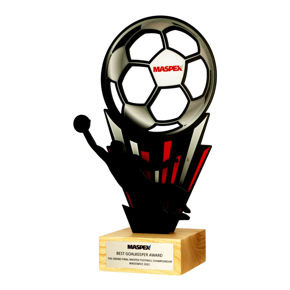 El fútbol es uno de los deportes de equipo más populares del mundo. Por eso, los organizadores de torneos de fútbol deben asegurarse de que su evento destaque entre los demás. El organizador del torneo MASPEX, para el que hemos preparado trofeos personalizados, lo sabe bien. Los trofeos que fabricamos son una combinación de dos paneles metálicos colocados sobre una base de madera. Cortamos los elementos metálicos con láser para que su forma hiciera referencia tanto al fútbol como a la categoría en la que se otorgaba el premio. Distinguimos cada categoría con una figura perfectamente recortada y diferente, por ejemplo, un portero. Además, el trofeo está relleno con una impresión colorida que complementa el tema futbolístico.