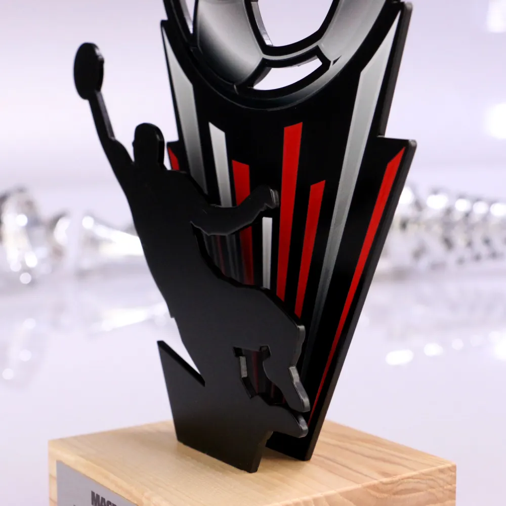 Trofeo alto de fútbol hecho de dos elementos de metal cortados con láser, colocados sobre una base de madera.