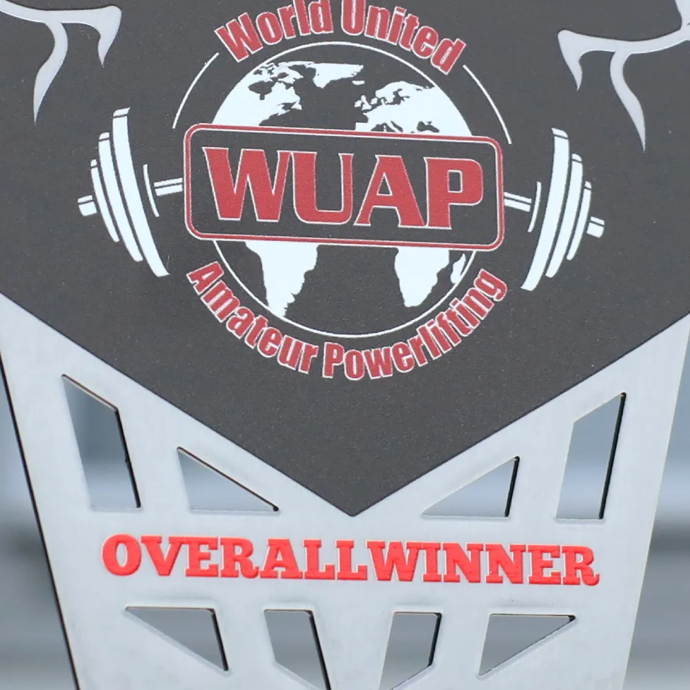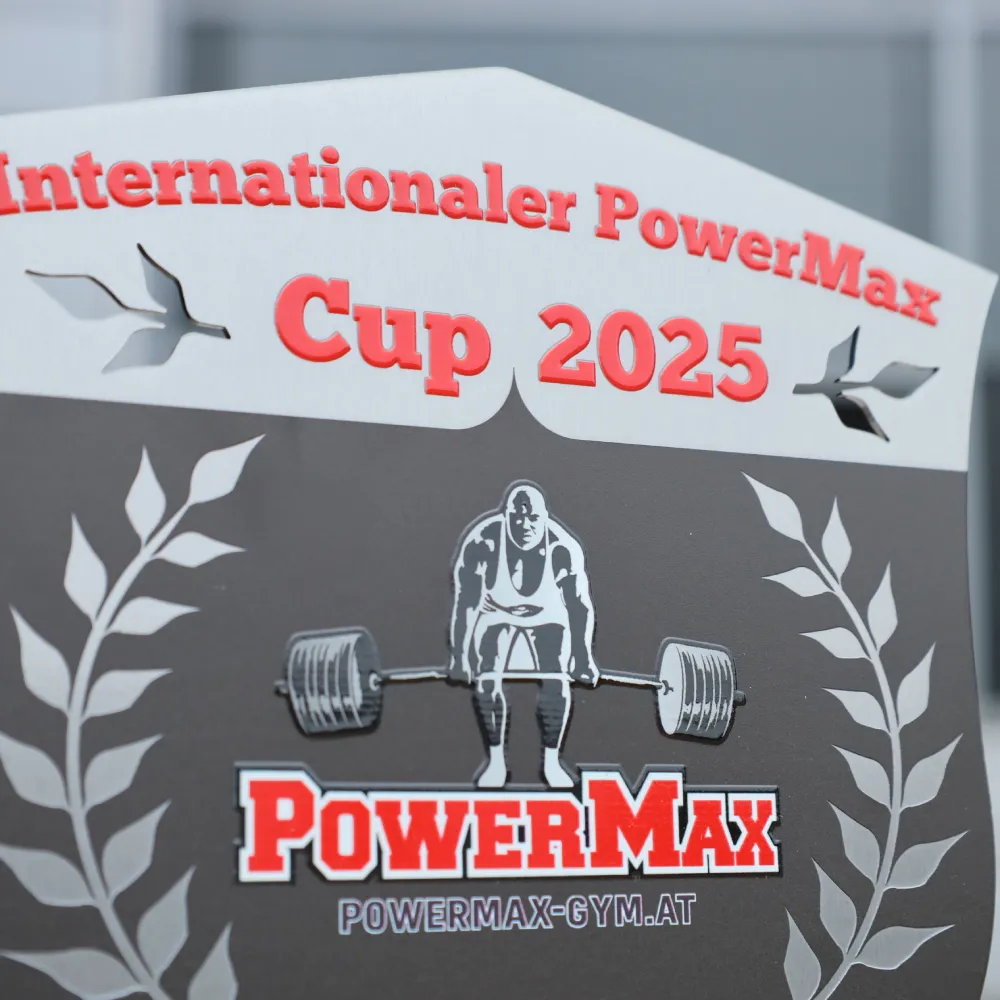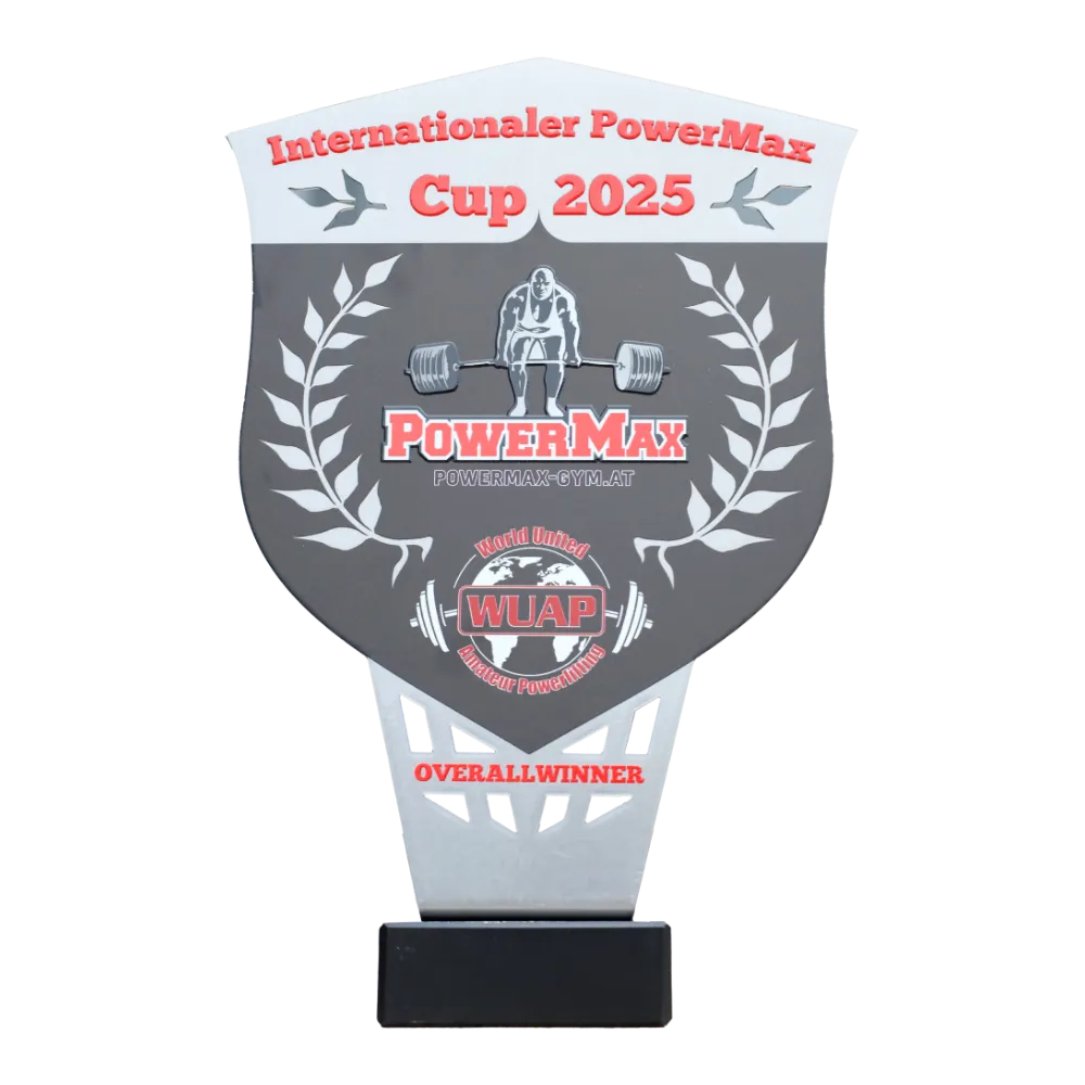Un trofeo personalizado creamos para Internationaler PowerMax Cup 2025. La parte superior la fabricamos en metal con impresión UV a todo color y la montamos sobre una base negra para estabilidad. El frente tiene forma de escudo con la silueta de un atleta levantando una barra, coronas de laurel y los logotipos de PowerMax y WUAP.