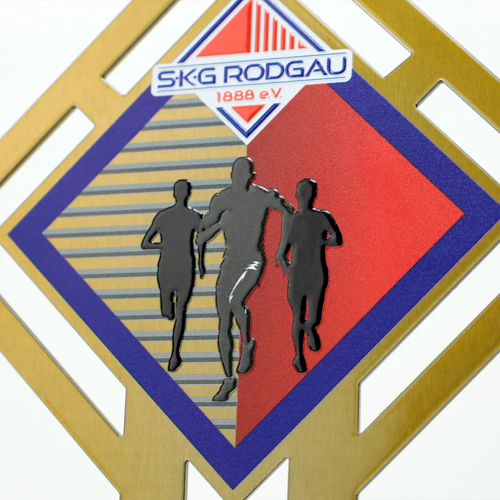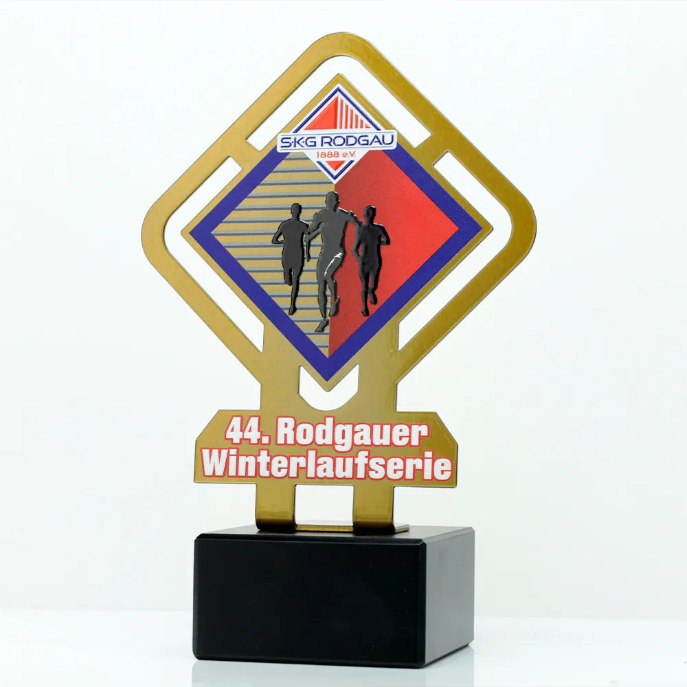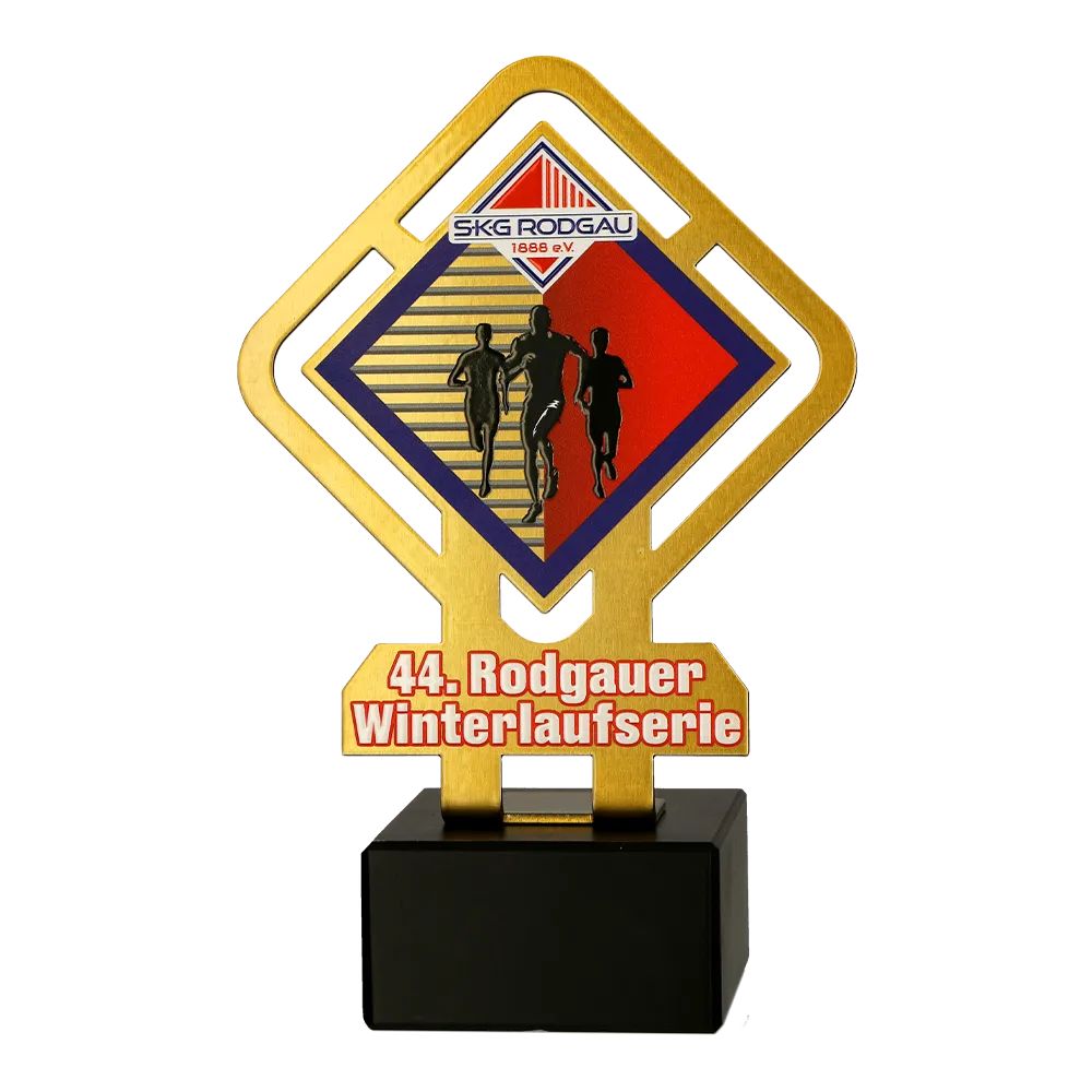 Trofeo para correr preparado para la 44ª edición de la Winter Running Series en Rodgau. El trofeo presenta un diseño geométrico con un motivo central de siluetas de corredores contra rayas dinámicas. Los gráficos y detalles se aplican mediante impresión UV, asegurando durabilidad y colores vibrantes. La base de mármol negro añade estabilidad y un toque de clase.