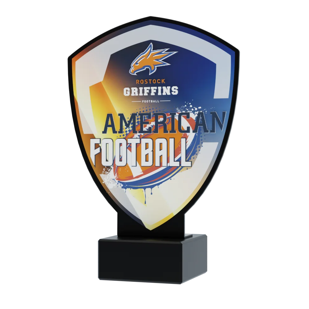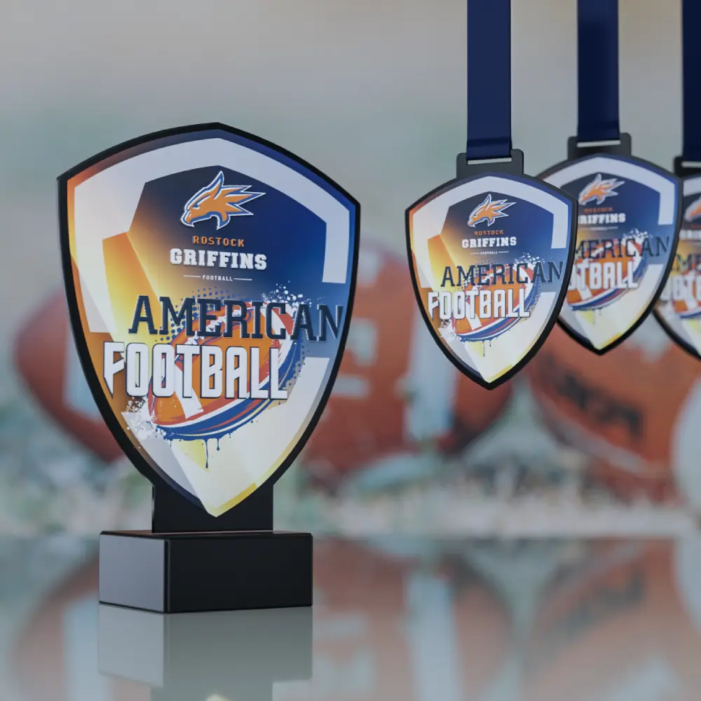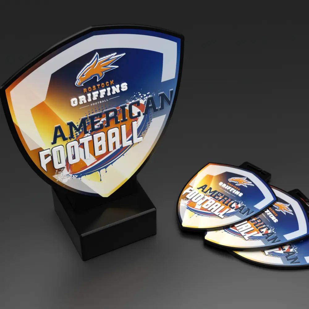 La victoria en fútbol americano es una mezcla de fuerza, estrategia y juego artístico. Los trofeos metálicos hechos para Rostock Griffins reflejan esto a la perfección. Los fabricamos en acero negro y los cubrimos con una impresión multicolor, que forma una composición cromática perfectamente coordinada. El elemento central del trofeo es el nombre, que hicimos mediante impresión 3D. Este detalle innovador añade un efecto de profundidad y atrae la atención, enfatizando la exclusividad del premio. Además, el trofeo complementa perfectamente las medallas, que en conjunto forman un set único con el que todo deportista soñará.
