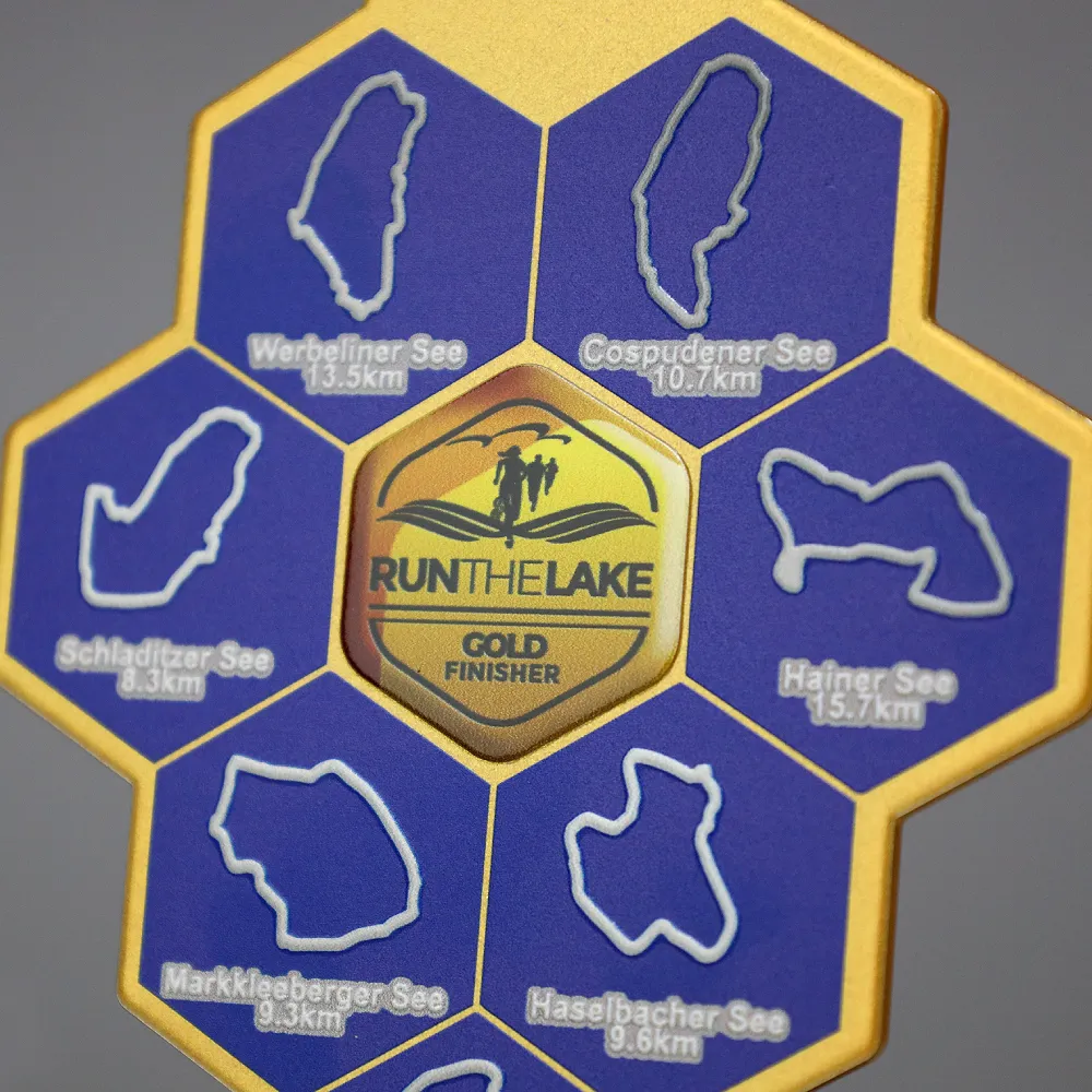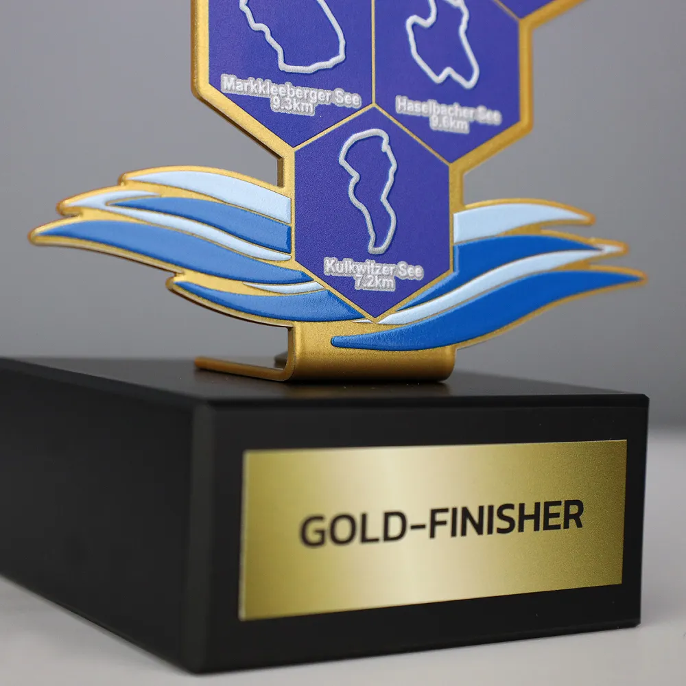 La impresión UV convexa y precisa hace que la estatuilla de Winmed destaque entre otras. Un trofeo deportivo no es solo un premio para los mejores atletas, sino también una tarjeta de presentación del evento que organizas. Por eso, las estatuillas para carreras deben estar en armonía con el ambiente y las características de la competición. Estas son las que preparamos para Run The Lake. Para su producción utilizamos metal cortado con láser, lo que nos permitió obtener una forma original y llamativa. Además, la estatuilla fue recubierta en color dorado, símbolo de la victoria, y decorada con un diseño colorido impreso en la superficie. Los elementos más distintivos, como los contornos de los ríos, se pueden incluso sentir al tacto.