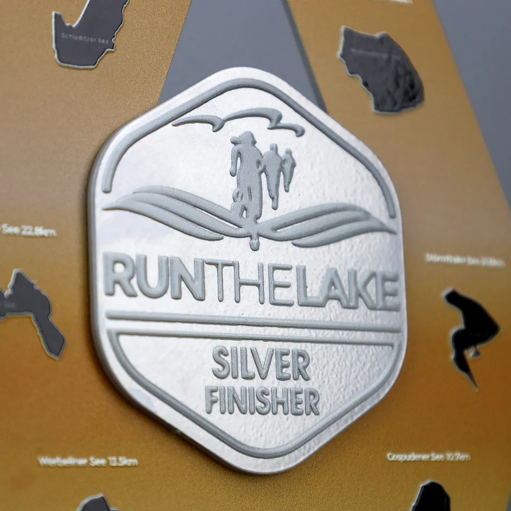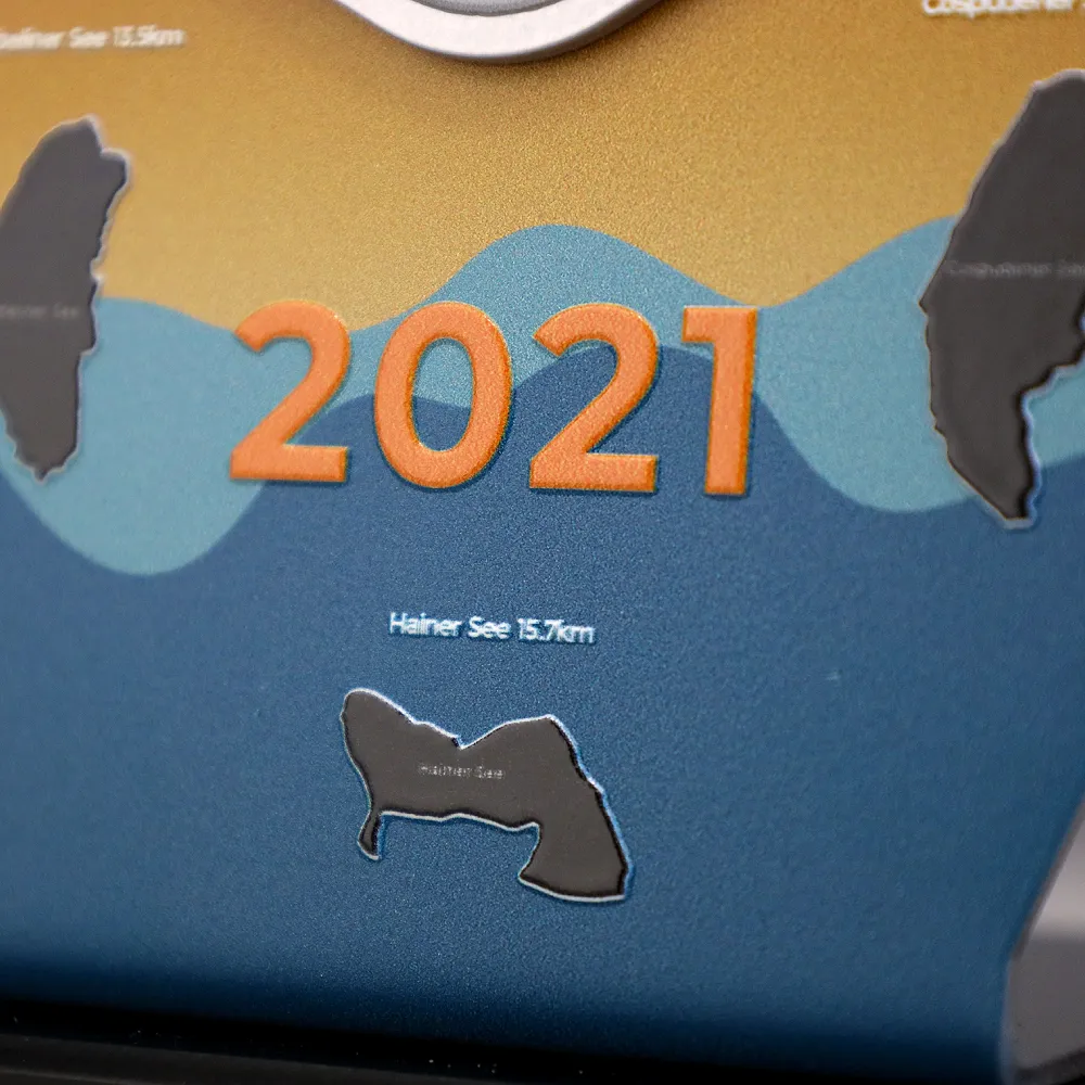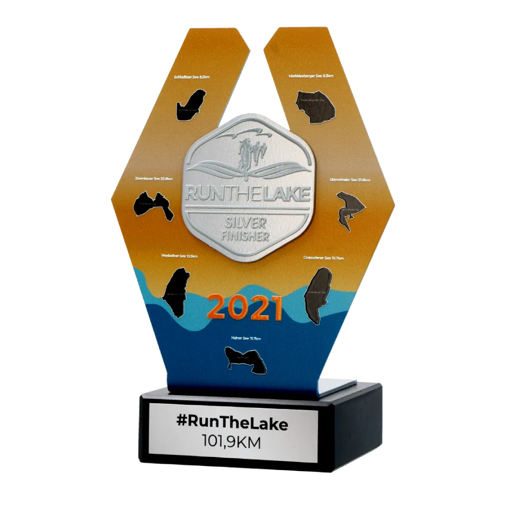 Como organizador de competiciones de running, deberías cuidar la originalidad de los trofeos que entregas. Winmed ha logrado hacerlo para la competición Run The Lake. Este trofeo personalizado fue cortado con láser para lograr una forma original. Además, lo recubrimos con una impresión colorida que está en relieve en algunas zonas. Gracias a esto, los elementos más característicos pueden sentirse al tacto.