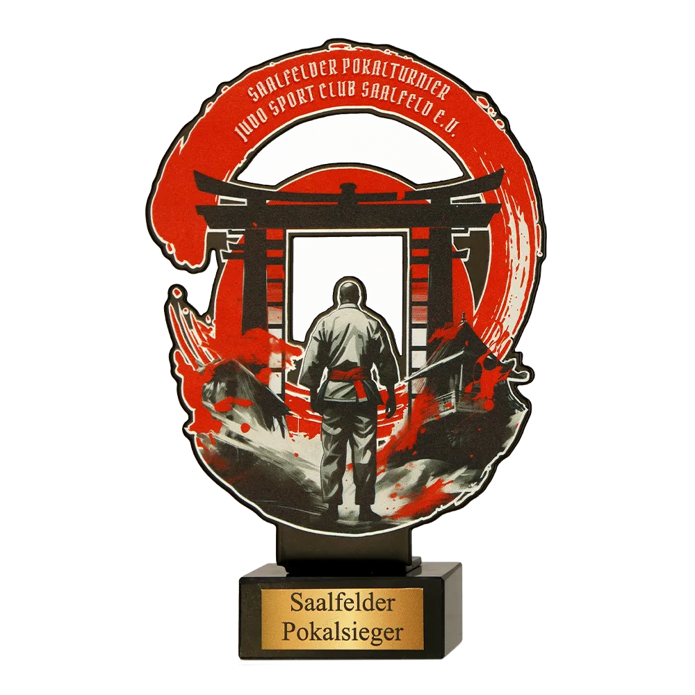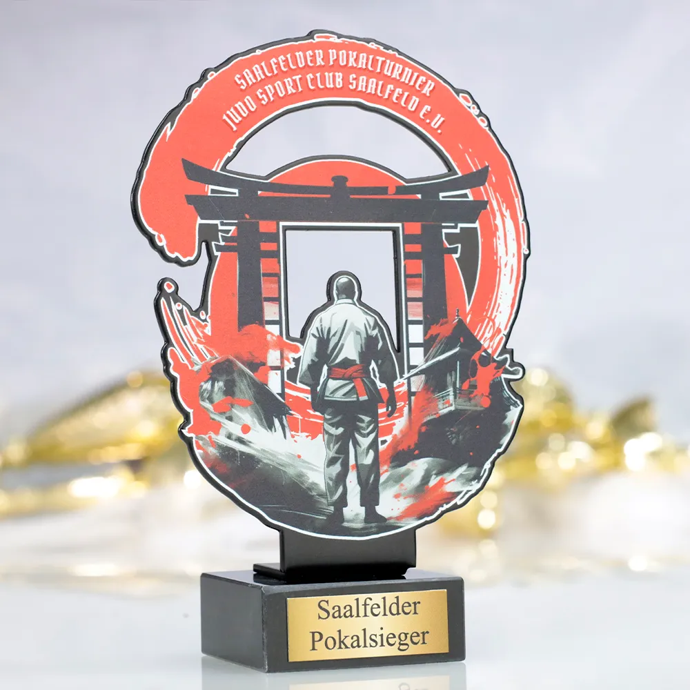 Trofeo deportivo personalizado hecho para el “Saalfelder Pokalturnier” organizado por el Judo Sport Club Saalfeld e.V. El trofeo está fabricado en metal con impresión UV, asegurando durabilidad y detalles gráficos precisos. La base de mármol añade elegancia y estabilidad. Este trofeo enérgico y con carácter combina diseño moderno con temas tradicionales de judo, siendo un reconocimiento perfecto para los mejores atletas.