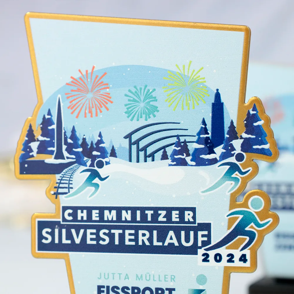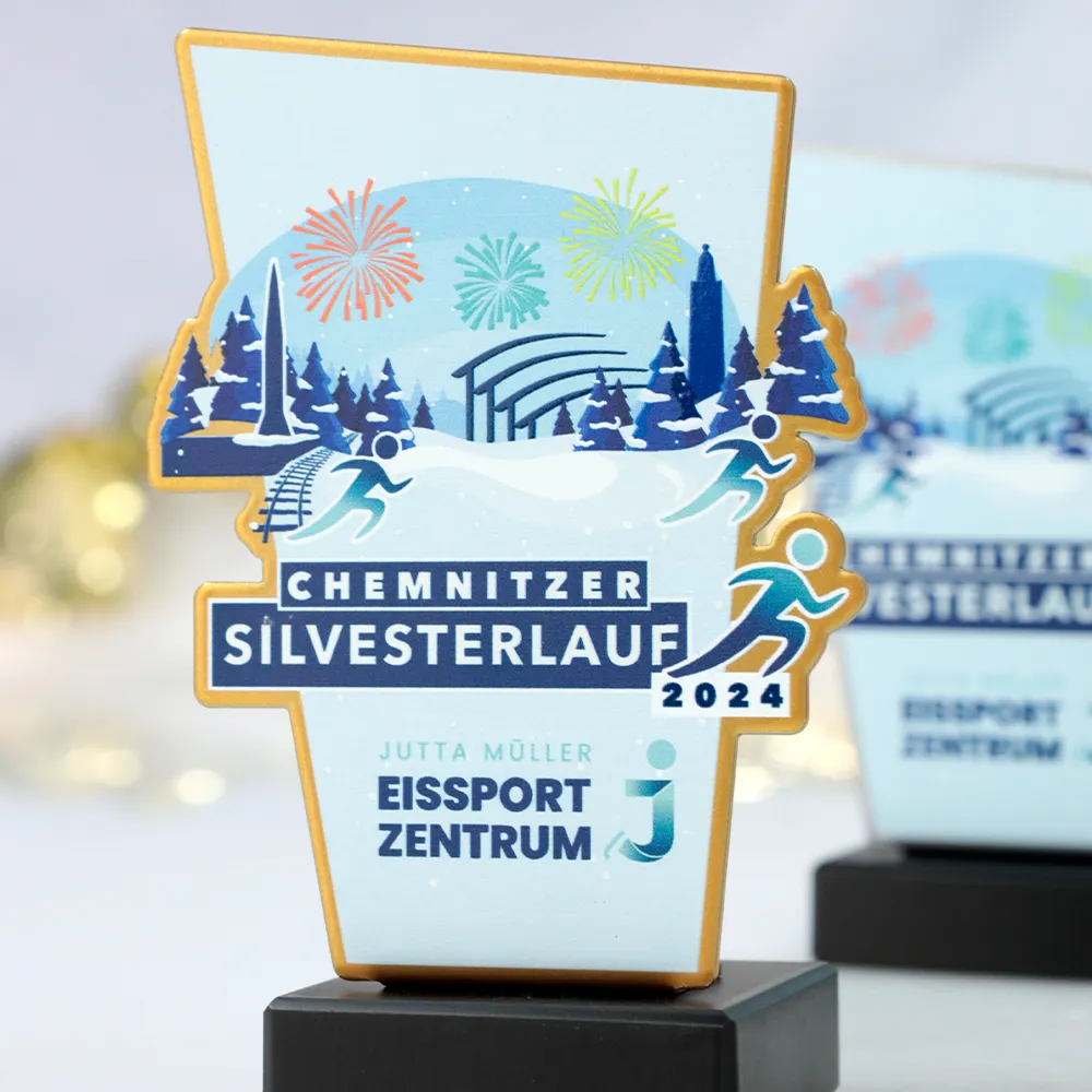Trofeo para correr diseñado para la carrera de fin de año en Chemnitz. El trofeo presenta un paisaje invernal con elementos gráficos como fuegos artificiales, nieve y corredores. Los principales destacados son el logo del evento y la inscripción “Chemnitzer Silvesterlauf 2024”, dándole un carácter único. Este trofeo moderno y colorido captura perfectamente la atmósfera invernal y festiva del evento.