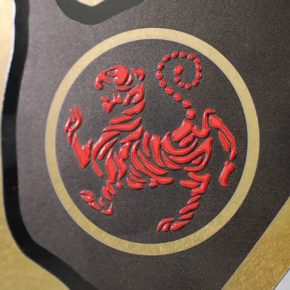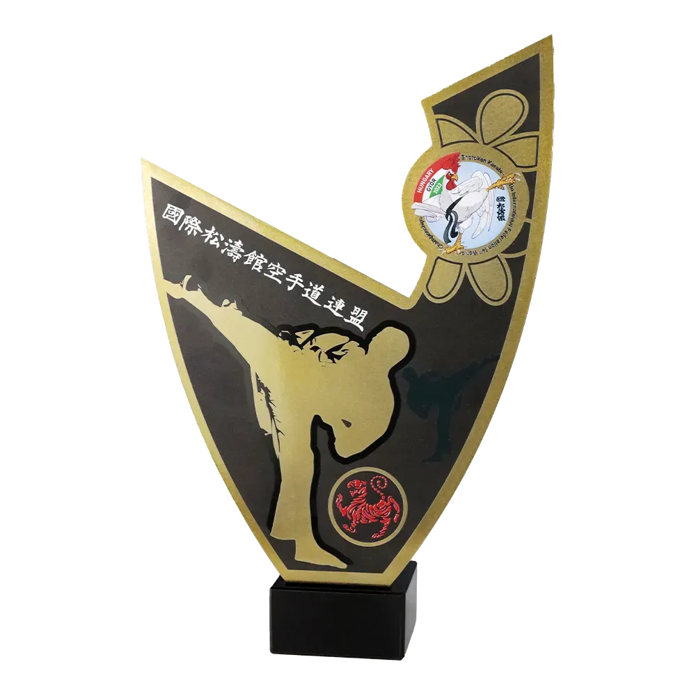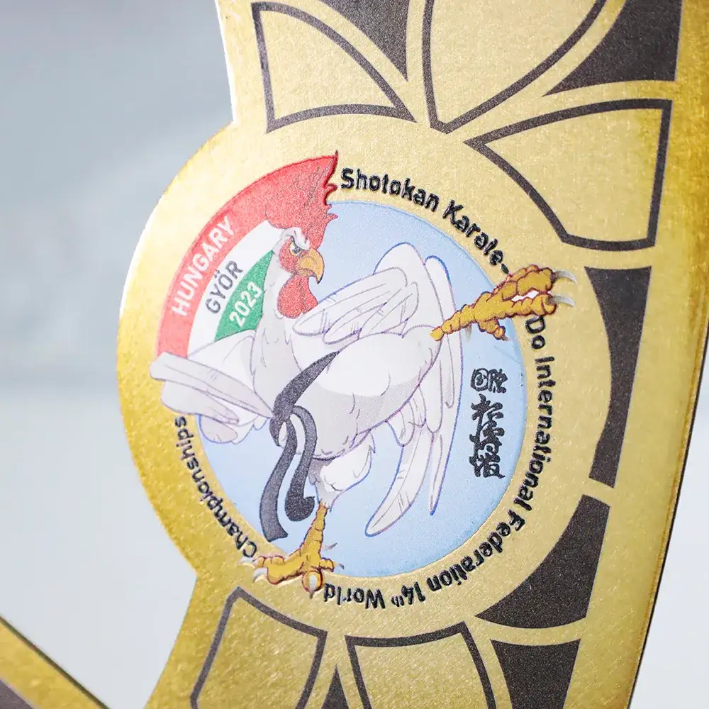 Este trofeo está hecho de metal y su forma fue cortada con láser con precisión. Las decoraciones coloridas fueron realizadas con una impresión UV duradera, lo que garantiza colores intensos. Es un trofeo personalizado creado especialmente para competiciones de karate.