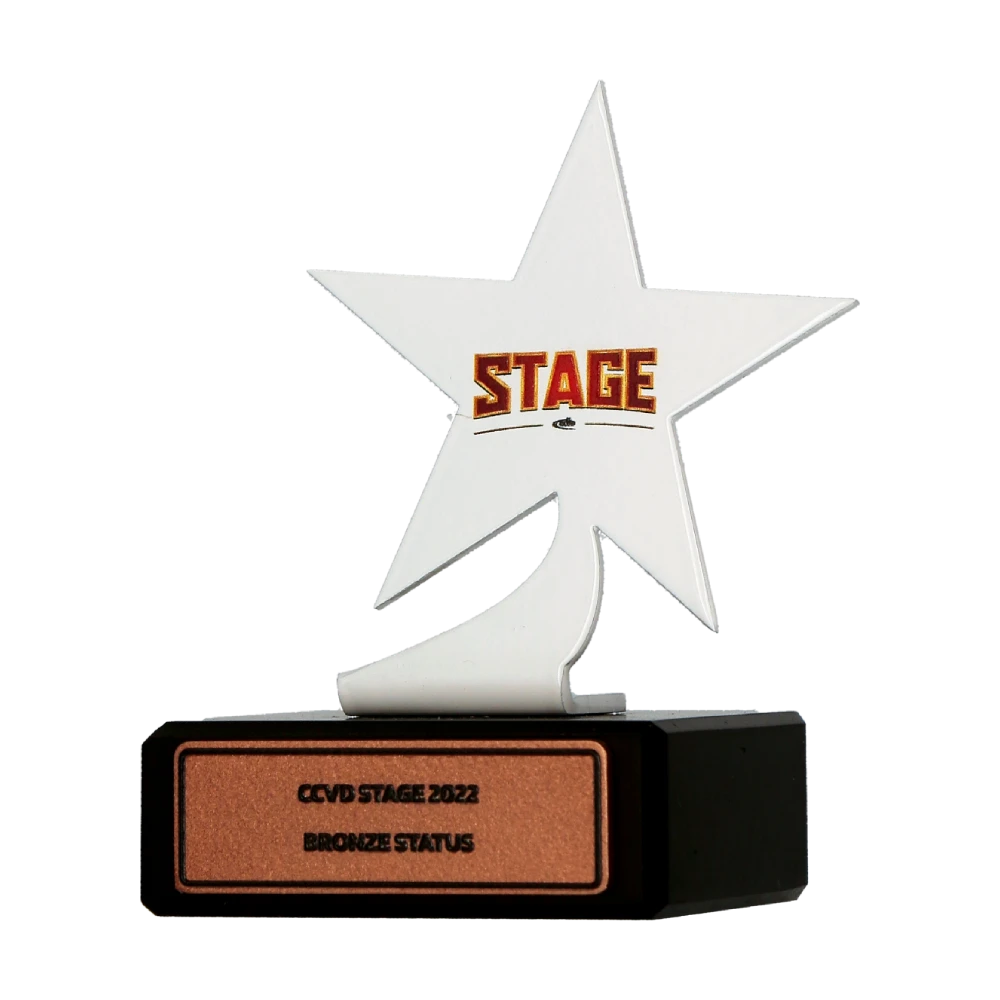 Un trofeo deportivo personalizado con forma de estrella sobre una base de mármol negro.