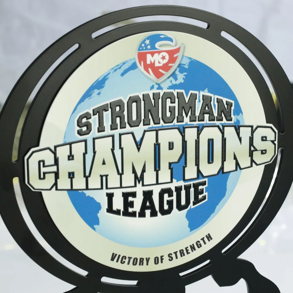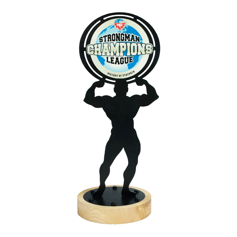 Trofeos personalizados para los mejores competidores en concursos de strongman, hechos de acero y adornados con colores vivos mediante tecnología de impresión UV. Toda la pieza está colocada sobre una base de madera.