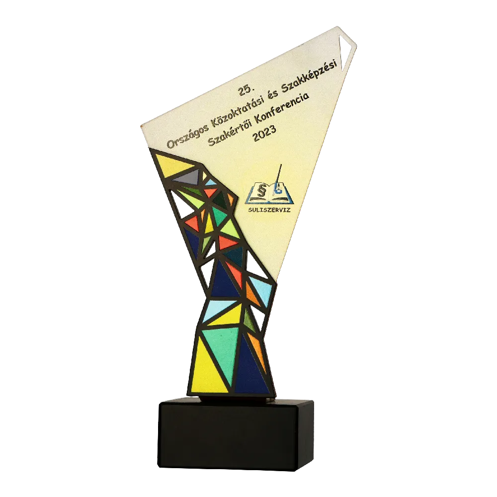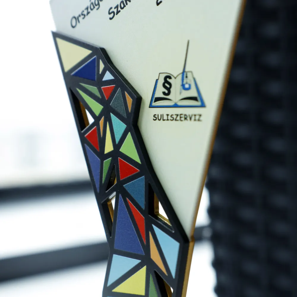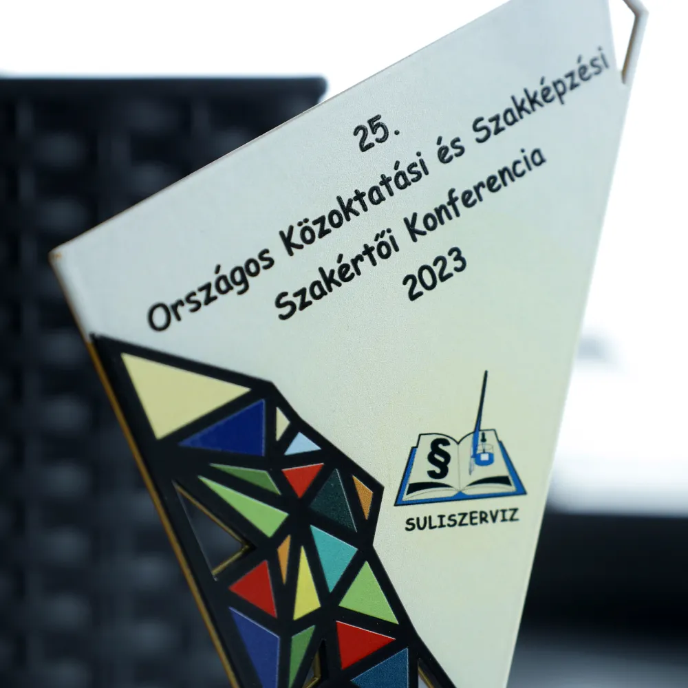 Trofeo personalizado hecho por nosotros para Suliszerviz. La forma de este trofeo y los recortes se hicieron usando láser. Las decoraciones fueron impresas mediante impresión UV. Está colocado sobre una base de mármol.