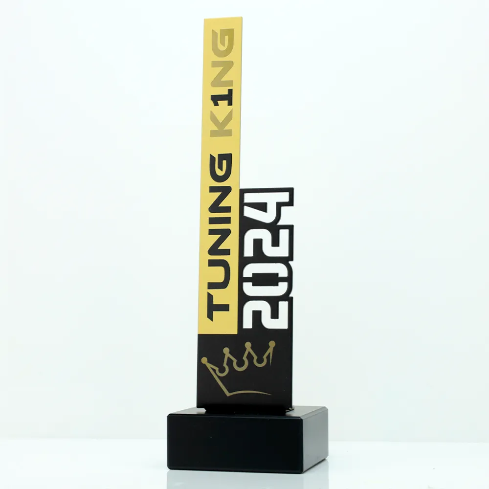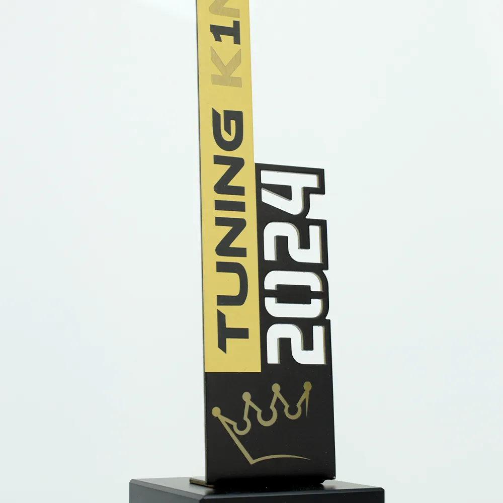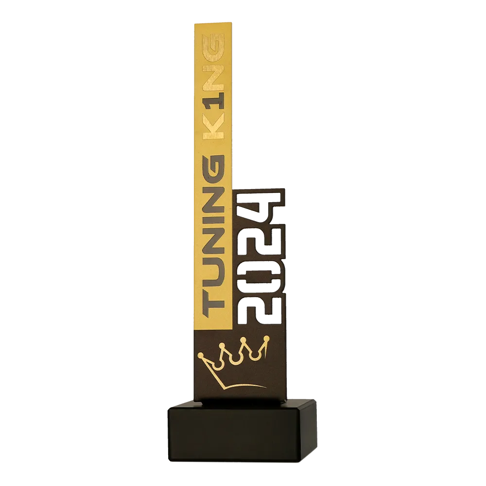 Trofeo de automovilismo creado para el evento “Tuning King 2024”. Un panel dorado con el nombre del evento y el año 2024 fue cortado con láser. El motivo de la corona enfatiza el prestigio del premio. La base de mármol asegura estabilidad y sofisticación.