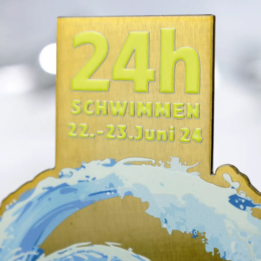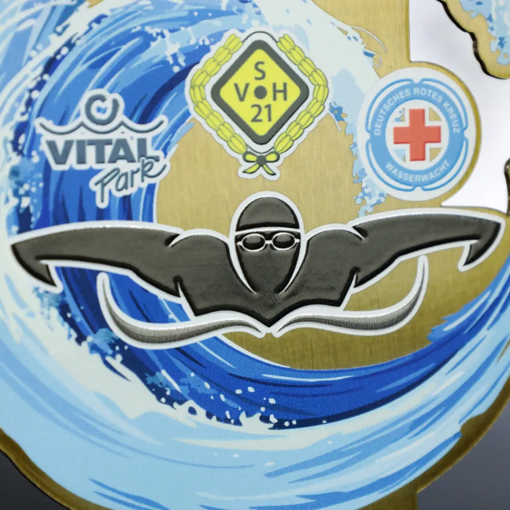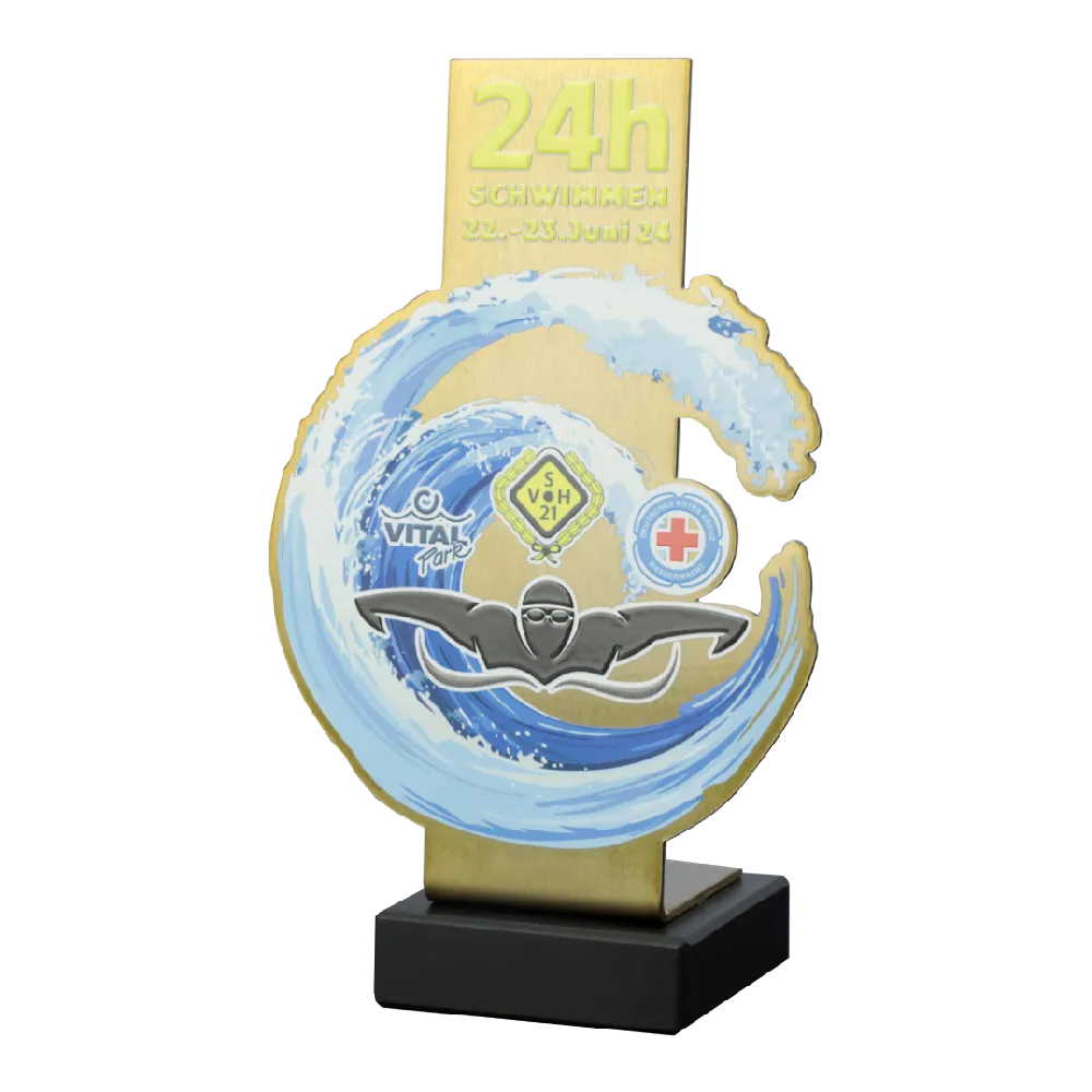 Trofeo de metal para natación diseñado específicamente para la competición VitalPark Schwimmen. El trofeo está hecho de acero de alta calidad, recubierto en dorado, con un gráfico que representa a un nadador rodeado por una ola dinámica, impreso directamente sobre el metal mediante moderna impresión UV.