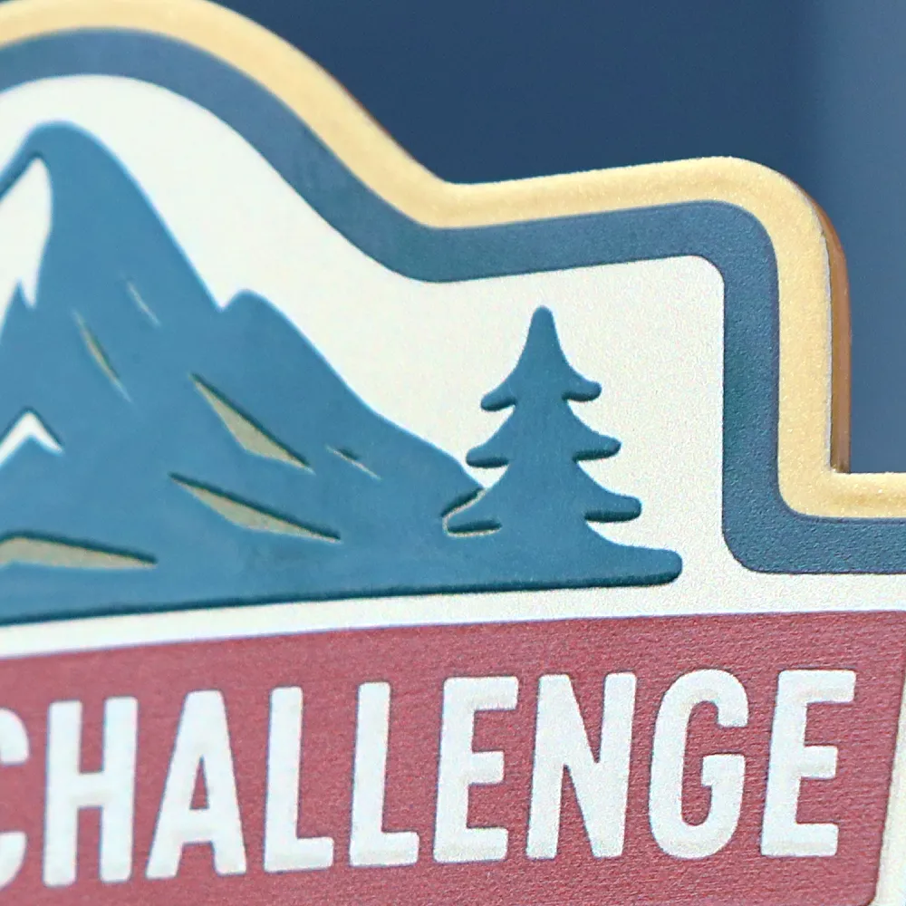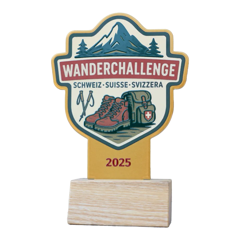 Premio moderno para los amantes de la montaña: frontal metálico con motivo de los Alpes, iconos de senderismo y nombre del evento, montado sobre sólida base de madera. La impresión UV duradera garantiza colores intensos y nitidez de detalles. Este trofeo personalizado está creado pensando en los participantes de marchas de montaña de larga distancia.
