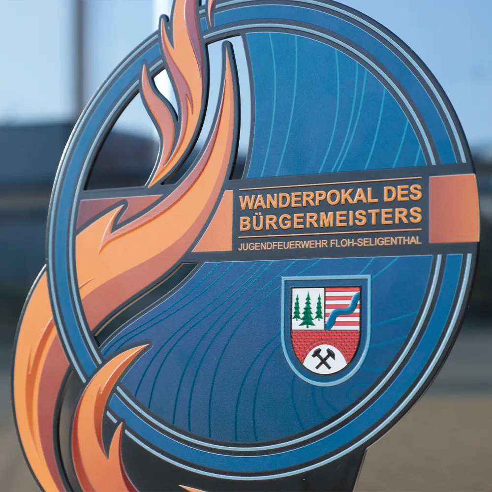 Trofeo personalizado diseñado para la competición juvenil de bomberos “Jugendfeuerwehr Floh-Seligenthal”. La combinación de símbolos locales y diseño dinámico le da al trofeo una apariencia distintiva, perfectamente acorde con la temática de competiciones juveniles de bomberos.