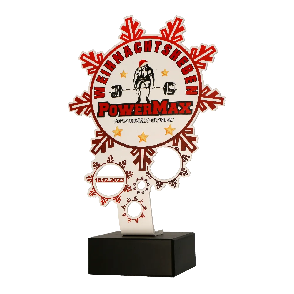 Trofeo deportivo personalizado creado para Weihnachtsheben PowerMax. Tiene forma de copo de nieve con un logo de competición colocado en el centro y la imagen de un atleta levantando peso. Construido en metal y colocado sobre una base de mármol.