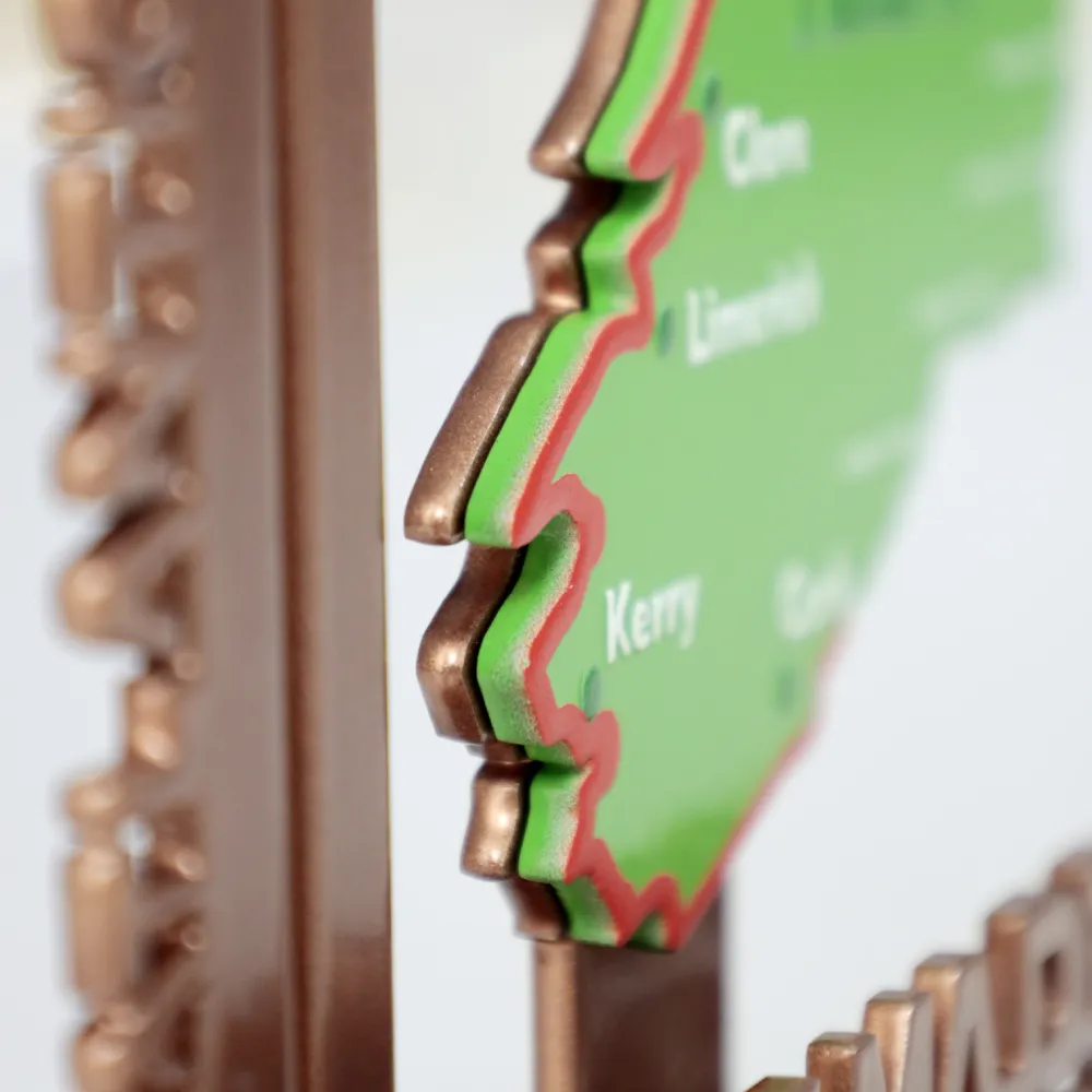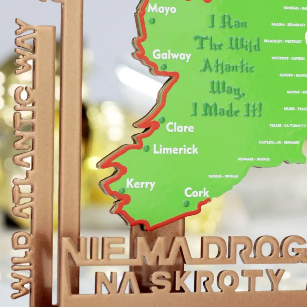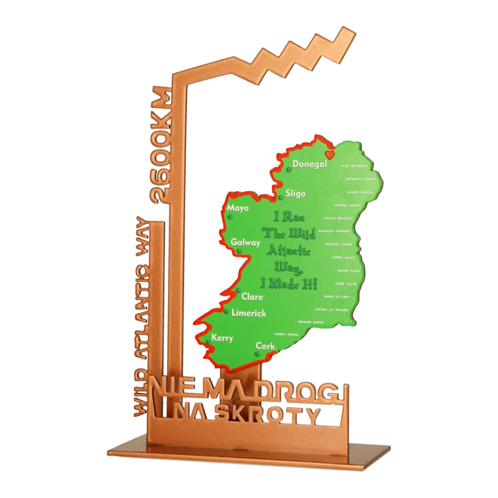 El trofeo de metal hecho a medida para el evento Wild Atlantic Way 2024 es un trofeo cortado con láser. Representa el contorno de Irlanda con regiones marcadas que simbolizan la ruta del evento. Las decoraciones y gráficos coloridos fueron aplicados usando impresión UV, dándoles un aspecto vibrante.