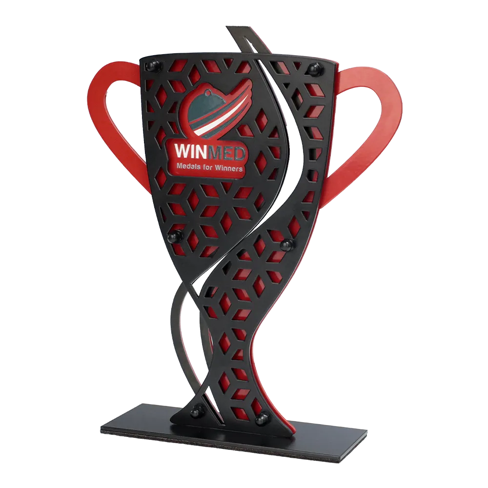 Un trofeo personalizado creado por nosotros. El trofeo tiene forma de copa con un diseño calado que forma interesantes patrones geométricos. Nuestro logo se muestra en la parte superior, impreso mediante impresión UV. El trofeo, incluida la base, está hecho completamente de metal, lo que lo hace robusto y duradero.