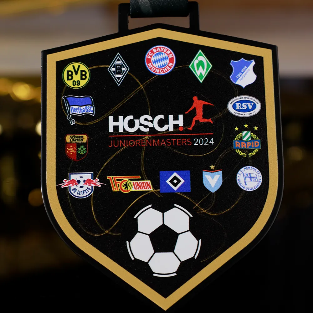 Una alternativa a la fundición tradicional son las medallas de acero con diseños impresos: son más delgadas pero robustas, con gráficos en color completo (por ejemplo, escudo del club o arte del torneo) impresos en la superficie. Otra opción interesante es la combinación de materiales: una medalla metálica con elementos de plástico o madera crea un efecto moderno y original. Por ejemplo, una inserción de madera en forma de balón refuerza una línea ecológica en el diseño.