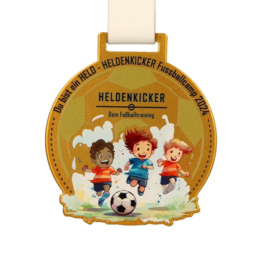 - Medallas UV impresas en color – Winmed también produce medallas con impresión UV a todo color, lo que permite posibilidades gráficas prácticamente ilimitadas. Estas medallas son especialmente populares en torneos infantiles, donde los diseños vivos y dinámicos despiertan entusiasmo y dibujan sonrisas en los jóvenes futbolistas.
