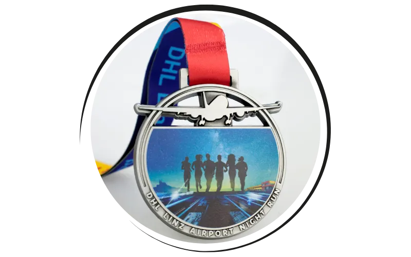 Combina el encanto de las medallas fundidas con impresiones UV vívidas. Perfectas cuando se desea incluir logotipos y elementos a todo color.